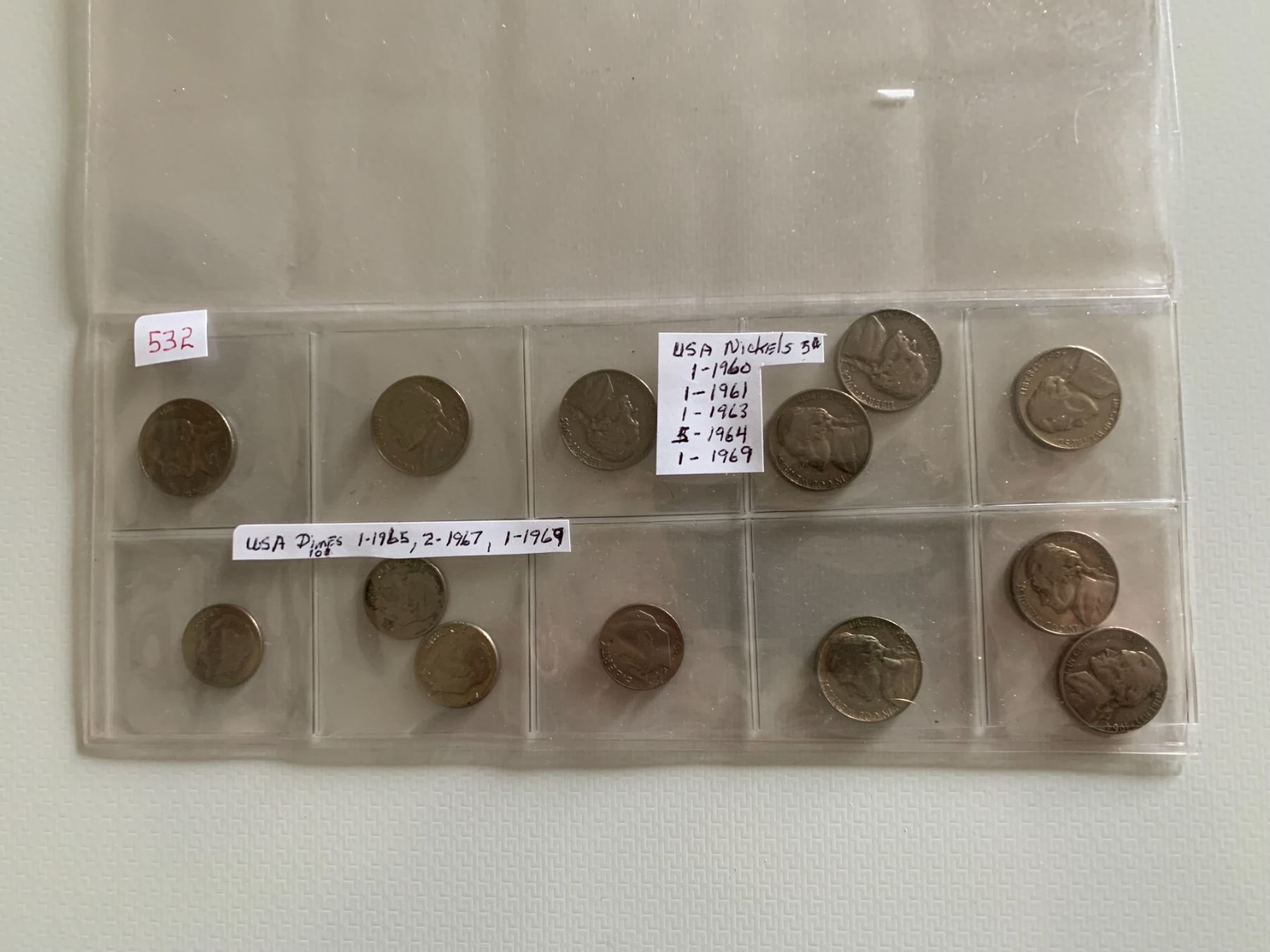 (All U.S. Coins)1 - 1960 5c, 1 - 1961 5c, 1 - 1963 5c, 1 - 1964 5c, 1 - 1969 5c, 1 - 1965 10c, 1 - 1967 10c, 1 - 1969 10c,
