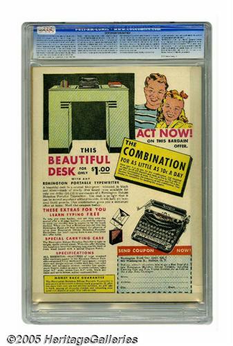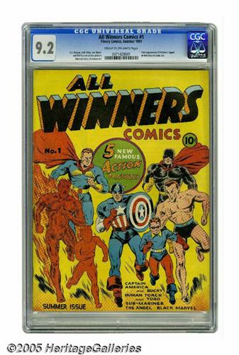 <B>All Winners Comics #1 (Timely, 1941) CGC NM- 9.2 Cream to off-white pages.</B></I> One of the most desirable Timelys, this issue currently ranks #32 on Overstreet's "Top 100 Golden Age Books" list, and with good reason. Its cover boasts classic characters as drawn by their legendary artists: Jack Kirby on Captain America, Bill Everett on the Sub-Mariner, Carl Burgos on the Human Torch, Paul Gustavson on the Angel, and Al Avison on the Black Marvel. To ice the cake, a 19-year-old Stan Lee introduced the All Winners Squad -- technically Marvel Comics' first superteam -- in a text story. Only one other copy has been certified with a higher grade by CGC at the time of this writing. Overstreet 2005 NM- 9.2 value = $35,000. CGC census 7/05: 2 in 9.2, 1 higher.