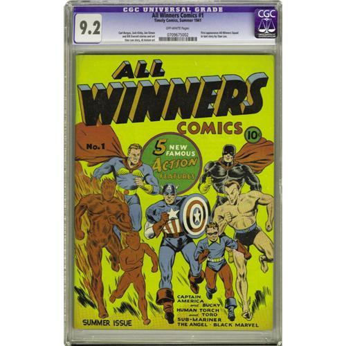 <B>All Winners Comics #1 (Timely, 1941) CGC NM- 9.2 Off-white pages.</B></I> The best that Timely had to offer made up the cast of this comic: the Human Torch, Captain America, the Sub-Mariner, the Angel, and the Black Marvel are here. They star in separate features, but a text story by youngster Stan Lee has the first appearance of the All-Winners Squad, which had Timely's top stars teaming up! That supergroup wouldn't appear in comic panels until #19. So there are winners aplenty on hand, and the guys drawing them weren't exactly a bunch of nobodies: Simon and Kirby contributed, as did Carl Burgos, Bill Everett, and cover artist Alex Schomburg. With so many points of collector interest, it's no wonder the issue is listed among the 40 most valuable Golden Age books by Overstreet. Only one solitary copy of the issue has been graded higher than this one by CGC to date. Overstreet 2006 NM- 9.2 value = $38,000. CGC census 7/06: 3 in 9.2, 1 higher. <BR><BR><B>Important notice:</B> Heritage usually auctions material at the rate of 200-250 lots per hour. On some occasions eBay Live bid software or the Internet may not be able to keep up with the pace of the auction. We recommend placing a realistic absentee bid now as insurance to avoid disappointment. Occasionally the auctioneer may eliminate or reject an eBay Live bid, and the auctioneer may also reopen a lot after the close of the eBay live bidding (usually because we missed an audience bid), and may reject your bid even if it shows you as the winning bidder. By bidding via eBay Live, you agree that Heritage may award the lot to another bidder at its sole discretion under the circumstances described above or any other reasonable circumstances. Since eBay bids are not shown to us until we open the lot on the floor, we treat those bids just like floor bids. In most cases the floor responds before the eBay bid is presented to us, due to Internet lag time, so for consistency we have made it a policy that floor bids are always considered first over tie eBay live bids. Also please note that all Heritage lots purchased through eBay Live carry a 22.5% Buyer's Premium. Please make sure you read the Terms and Conditions before you bid. This lot is being auctioned in conjunction with a live floor auction by Heritage Auction Galleries. All final auction and invoice information will be supplied by Heritage Auction Galleries, and all other information should be considered preliminary. Lot:41001 <BR><BR><B>Winning Notification and Billing:</B> After the FINAL session in this auction is complete, Heritage will send e-mail and snail mail invoices. This process normally takes several days. All final auction and invoice information will be supplied by Heritage Auction Galleries, and all other information should be considered preliminary. <BR><BR>This auction will be conducted on a live auction floor and over the Internet through eBay Live. If you choose to place an absentee bid, please take a moment to <font color='#0000ff'><u><a href='http://pages.ebay.com/liveauctions/help/before/laabsentee.html'>learn how eBay Live absentee bidding works</a></u></font><font color='#000000'>