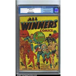 All-Winners Comics #1 (Timely, 1941). This issue has it all! For the first time ever, Timely teamed up Cap, Torch and Subby in one book, bringing readers a triple-dose of power-packed action. A popular series among Timely aficionados, All-Winners ran the course of WWII, delivering classic Schomburg covers along the way. This copy is very attractive, with no tears or missing pieces to speak of, and only average reading wear. Considering the high value of All-Winners #1, an unrestored copy in this condition satisfies the wallet without sacrificing aesthetic appeal. CGC VG+ 4.5 Cream to off-white pages. Overstreet 2001 GD 2.0 value = $1,600; FN 6.0 value = $4,800. Important notice: We expect to be auctioning lots at the rate of 200-250 per hour. Sometimes eBay Premier live bid software cannot keep up with that pace, so we strongly recommend that you place a realistic proxy bid now as insurance to avoid disappointment. Also please note that all Heritage/CAA lots purchased through eBay Premier carry a 20% Buyer's Premium.