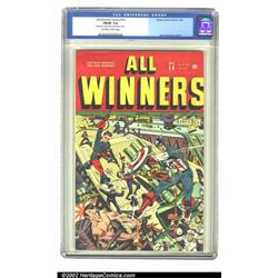 All Winners Comics #14 (Timely, 1944) CGC FN/VF 7.0 Off-white to white pages. Taking the battle to Japanese shores, Cap and cohorts plow into an imperial battleship, wreaking havoc as they please. This book is gorgeous, looking NM with a bright, clean cover, but has several dents visible, mainly on the back. Overstreet 2002 FN 6.0 value = $381; VF 8.0 value = $795. Important notice: We expect to be auctioning lots at the rate of 200-250 per hour. Sometimes eBay Premier live bid software cannot keep up with that pace, so we strongly recommend that you place a realistic proxy bid now as insurance to avoid disappointment. Also please note that all Heritage/CAA lots purchased through eBay Premier carry a 20% Buyer's Premium. Please make sure you read the Terms and Conditions.