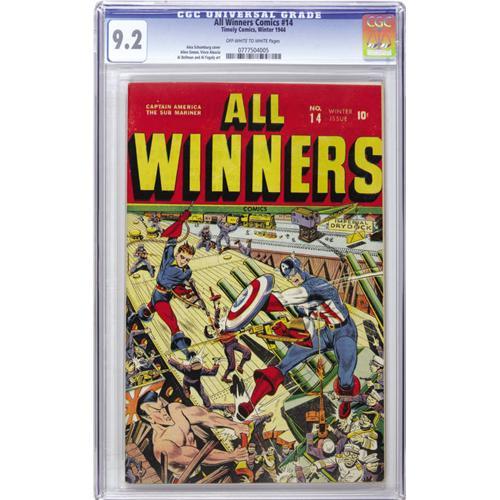 <B>All Winners Comics #14 (Timely, 1944) CGC NM- 9.2 Off-white to white pages.</B></I> This sensational copy is bested by only one other in CGC's current census. Timely made this an all-Al artists issue with a great cover by Alex Schomburg, and interior work from Allen Simon, Al Bellman, Al Fagaly, and Al Lascia... er, Vince Alascia! Good for what Al's ya! Overstreet 2006 NM- 9.2 value = $2,000. CGC census 10/06: 1 in 9.2, 1 higher.<BR><BR><b>Shipping:</b> Slabbed Comic (<a target="_blank" href="http://www.heritageauctions.com/common/shipping.php">view shipping information</a>)