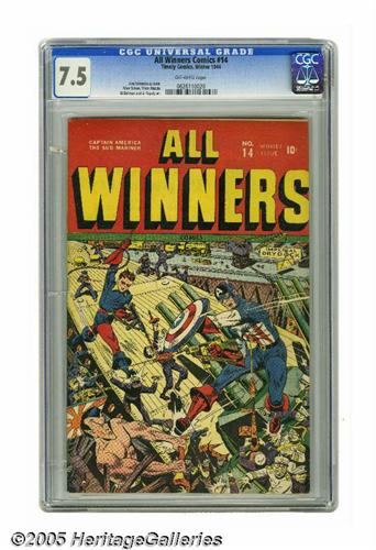 <B>All Winners Comics #14 (Timely, 1944) CGC VF- 7.5 Off-white pages.</B></I> It may seem a modest grade, but at VF- 7.5 this copy ranks as the third highest-graded unrestored copy CGC has certified to date. The Alex Schomburg cover art is backed by interior work from Vince Alascia, Allen Simon, Al Fagaly, and Al Bellman. Overstreet 2005 VF 8.0 value = $888. CGC census 7/05: 1 in 7.5, 2 higher.