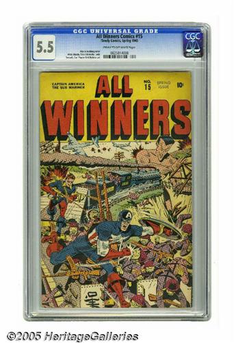 <B>All Winners Comics #15 (Timely, 1945) CGC FN- 5.5 Cream to off-white pages.</B></I> Cap, Bucky, and the Sub-Mariner assist in the invasion of Japan on yet another outrageous cover from the prolific Alex Schomburg. Interior art contributors include Vince Alascia and Mike Sekowsky. Overstreet 2005 FN 6.0 value = $426. CGC census 6/05: 1 in 5.5, 8 higher.