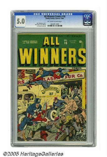 <B>All Winners Comics #16 (Timely, 1945) CGC VG/FN 5.0 Off-white to white pages.</B></I> Alex Schomburg cover. Allen Simon and Vince Alascia art. Overstreet 2005 VG 4.0 value = $284; FN 6.0 value = $426. CGC census 6/05: 1 in 5.0, 7 higher.