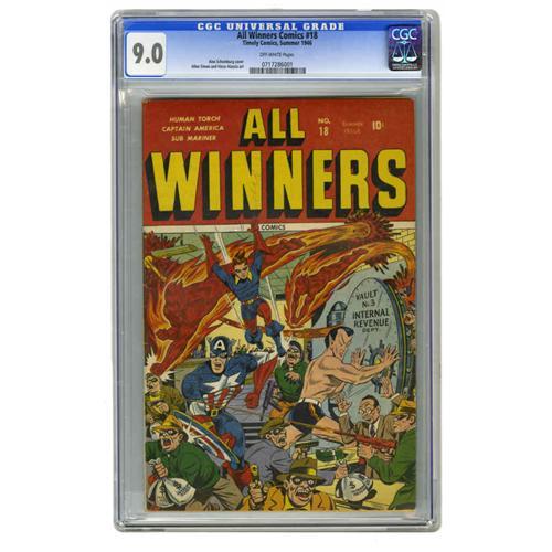 <B>All Winners Comics #18 (Timely, 1946) CGC VF/NM 9.0 Off-white pages.</B></I> Alex Schomburg's action-packed cover illustration shows a gang of crooks robbing the Internal Revenue vaults -- only to be stymied by the All Winners team of Captain America, Human Torch, and Sub-Mariner! Save those tax-payer dollars! This solid, attractive example is currently tied with one other as the highest CGC-graded copy of issue #18. Overstreet 2005 VF/NM 9.0 value = $1,369; NM- 9.2 value = $1,850. CGC census 11/05: 3 in 9.0, none higher.