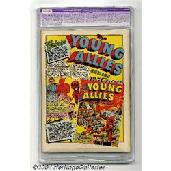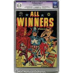 <B>All Winners Comics #2 (Timely, 1941) CGC Apparent VF 8.0 Slight (P) Cream to off-white pages.</B></I> Top heroes Human Torch, Captain America, and Sub-Mariner salute newcomers the Destroyer (from the pages of <B>Mystic Comics</B></I>) and the Whizzer (from <B>USA Comics</B></I>) on Jack Binder's cover. The impressive lineup of interior artists is headlined by Simon and Kirby (drawing their creation Captain America), Paul Reinman, and Carl Burgos, as well as Binder, whose Destroyer story has appearances by Hitler and fellow Nazi Rudolf Hess. Even the back cover is interesting, it's a full-page ad for <B>Young Allies</B></I> #1. CGC notes, "Restoration includes: small amount of color touch on cover, glue on spine of cover." Overstreet 2004 GD 2.0 value = $483; VG 4.0 value = $966; FN 6.0 value = $1,449; VF 8.0 value = $3,381. <BR><BR><B>Important notice:</B> Heritage usually auctions material at the rate of 200-250 lots per hour. On some occasions eBay Live bid software or the Internet may not be able to keep up with the pace of the auction. We recommend placing a realistic absentee bid now as insurance to avoid disappointment. Occasionally the auctioneer may eliminate or reject an eBay Live bid, and the auctioneer may also reopen a lot after the close of the eBay live bidding (usually because we missed an audience bid), and may reject your bid even if it shows you as the winning bidder. By bidding via eBay Live, you agree that Heritage may award the lot to another bidder at its sole discretion under the circumstances described above or any other reasonable circumstances. Since eBay bids are not shown to us until we open the lot on the floor, we treat those bids just like floor bids. In most cases the floor responds before the eBay bid is presented to us, due to Internet lag time, so for consistency we have made it a policy that floor bids are always considered first over tie eBay live bids. Also please note that all Heritage lots purchased through eBay Live carry a 20% Buyer's Premium. Please make sure you read the Terms and Conditions before you bid.