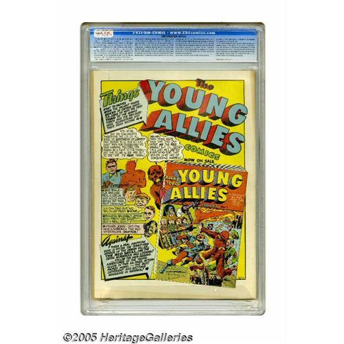 <B>All Winners Comics #2 (Timely, 1941) CGC FN- 5.5 Cream to off-white pages.</B></I> Top heroes Human Torch, Captain America, and Sub-Mariner are joined by newcomers the Destroyer (from the pages of " <B>Mystic Comics</B></I>) and the Whizzer (from "<B>USA Comics</B></I>) here, as seen on the cover by Jack Binder. The impressive lineup of interior artists is headlined by Simon and Kirby (drawing their creation Captain America), Paul Reinman, and Carl Burgos, as well as Binder, whose Destroyer story has appearances by Hitler and fellow nefarious Nazi Rudolf Hess. Even the back cover is interesting, it's a full-page ad for " "<B>Young Allies</B></I> #1. Overstreet 2005 FN 6.0 value = $1,452. CGC census 9/05: 1 in 5.5, 4 higher. <I>From the Aviator Collection</B></I>. <BR><BR><B>Important notice:</B> Heritage usually auctions material at the rate of 200-250 lots per hour. On some occasions eBay Live bid software or the Internet may not be able to keep up with the pace of the auction. We recommend placing a realistic absentee bid now as insurance to avoid disappointment. Occasionally the auctioneer may eliminate or reject an eBay Live bid, and the auctioneer may also reopen a lot after the close of the eBay live bidding (usually because we missed an audience bid), and may reject your bid even if it shows you as the winning bidder. By bidding via eBay Live, you agree that Heritage may award the lot to another bidder at its sole discretion under the circumstances described above or any other reasonable circumstances. Since eBay bids are not shown to us until we open the lot on the floor, we treat those bids just like floor bids. In most cases the floor responds before the eBay bid is presented to us, due to Internet lag time, so for consistency we have made it a policy that floor bids are always considered first over tie eBay live bids. Also please note that all Heritage lots purchased through eBay Live carry a 20% Buyer's Premium. Please make sure you read the Terms a