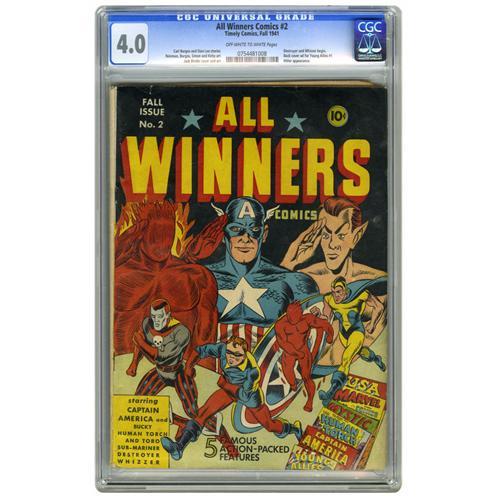 <B>All Winners Comics #2 (Timely, 1941) CGC VG 4.0 Off-white to white pages.</B></I> This issue brought together Timely's top three heroes, namely the Human Torch, Captain America, and Sub-Mariner, and added the Destroyer (from the pages of <B>Mystic Comics</B></I>) and the Whizzer (from <B>USA Comics</B></I>). The issue's impressive lineup of interior artists is headlined by Simon and Kirby (drawing their creation Captain America), Paul Reinman, and Carl Burgos, as well as Jack Binder, whose Destroyer story has appearances by Hitler and fellow nefarious Nazi Rudolf Hess. The cover illustration is also by Binder. Overstreet 2006 VG 4.0 value = $970. CGC census 3/06: 2 in 4.0, 7 higher.
