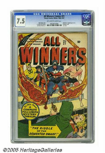 <B>All Winners Comics #21 (Timely, 1947) CGC VF- 7.5 Off-white to white pages.</B></I> This one just doesn't turn up often in any condition. Overstreet calls it "scarce," and Gerber goes so far as to designate it "rare." It's one of the nicest copies of issue #21 that CGC has graded to date. The superheroes-heavy bondage cover is by Syd Shores. Overstreet 2005 VF 8.0 value = $2,555. CGC census 6/05: 3 in 7.5, 5 higher.
