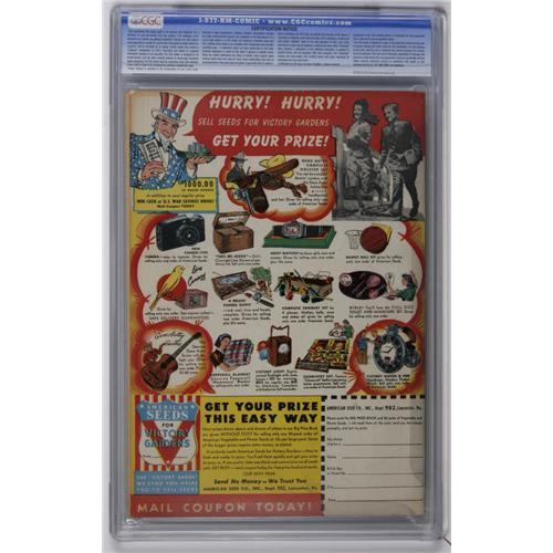 We don't see this issue very often, which is a shame, because it's got a rousing Alex Schomburg cover! Inside the comic, Timely's "Big Three" of Captain America, Sub-Mariner, and Human Torch (appearing in separate stories) are joined by the Whizzer and the Destroyer. There's no top-grade copy on CGC's census (with an 8.5 leading the pack as of now), so this mid-grade copy is an attractive option. Overstreet 2006 FN 6.0 value = $612. CGC census 12/06: 1 in 6.0, 5 higher.<BR><BR><b>Shipping:</b> Slabbed Comic (<a target="_blank" href="http://www.heritageauctions.com/common/shipping.php">view shipping information</a>)