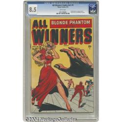<B>All Winners Comics V2#1 (Timely, 1948) CGC VF+ 8.5 White pages.</B></I> The revival of this great title lasted for only one issue before becoming ... <B>All Western Winners</B></I>? Sorry cowboys, but if it's a choice between some range-ridin' buckaroos or the sexy Blonde Phantom, we'll go with the Phantom every time. As distracted as we are by the lady's lovely leg, we'll note that Timely stars Sub-Mariner, Human Torch, and Captain America also appear. The issue's artists include Bob Powell and Syd Shores. Overstreet 2004 VF 8.0 value = $1,800; VF/NM 9.0 value = $2,700. <BR><BR><B>Important notice:</B> Heritage usually auctions material at the rate of 200-250 lots per hour. On some occasions eBay Live bid software or the Internet may not be able to keep up with the pace of the auction. We recommend placing a realistic absentee bid now as insurance to avoid disappointment. Occasionally the auctioneer may eliminate or reject an eBay Live bid, and the auctioneer may also reopen a lot after the close of the eBay live bidding (usually because we missed an audience bid), and may reject your bid even if it shows you as the winning bidder. By bidding via eBay Live, you agree that Heritage may award the lot to another bidder at its sole discretion under the circumstances described above or any other reasonable circumstances. Since eBay bids are not shown to us until we open the lot on the floor, we treat those bids just like floor bids. In most cases the floor responds before the eBay bid is presented to us, due to Internet lag time, so for consistency we have made it a policy that floor bids are always considered first over tie eBay live bids. Also please note that all Heritage lots purchased through eBay Live carry a 20% Buyer's Premium. Please make sure you read the Terms and Conditions before you bid.