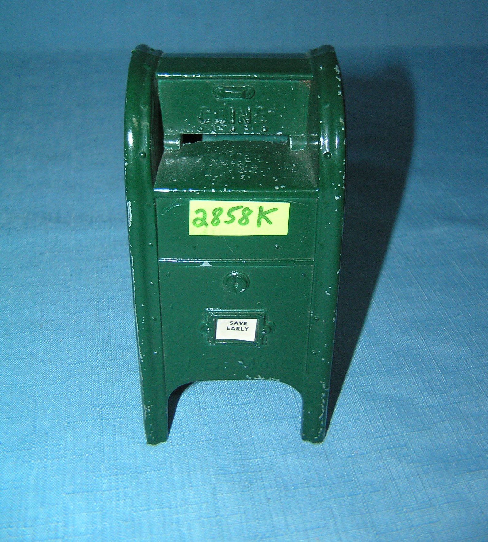 All cast metal hand painted US mail box bank with key lock trap but no key est. value $125.00-$150.00