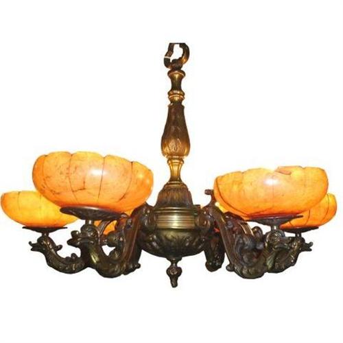 This bronze chandelier with four alabaster tulips was rescued from a demolition site and it is in perfect condition. Shipping cost in USA : $ 100.00. Some assembling may be required. It was rewired to USA standards.Due to the nature of alabaster stone the pictures may not accurately represented the color and pattern of the alabaster.