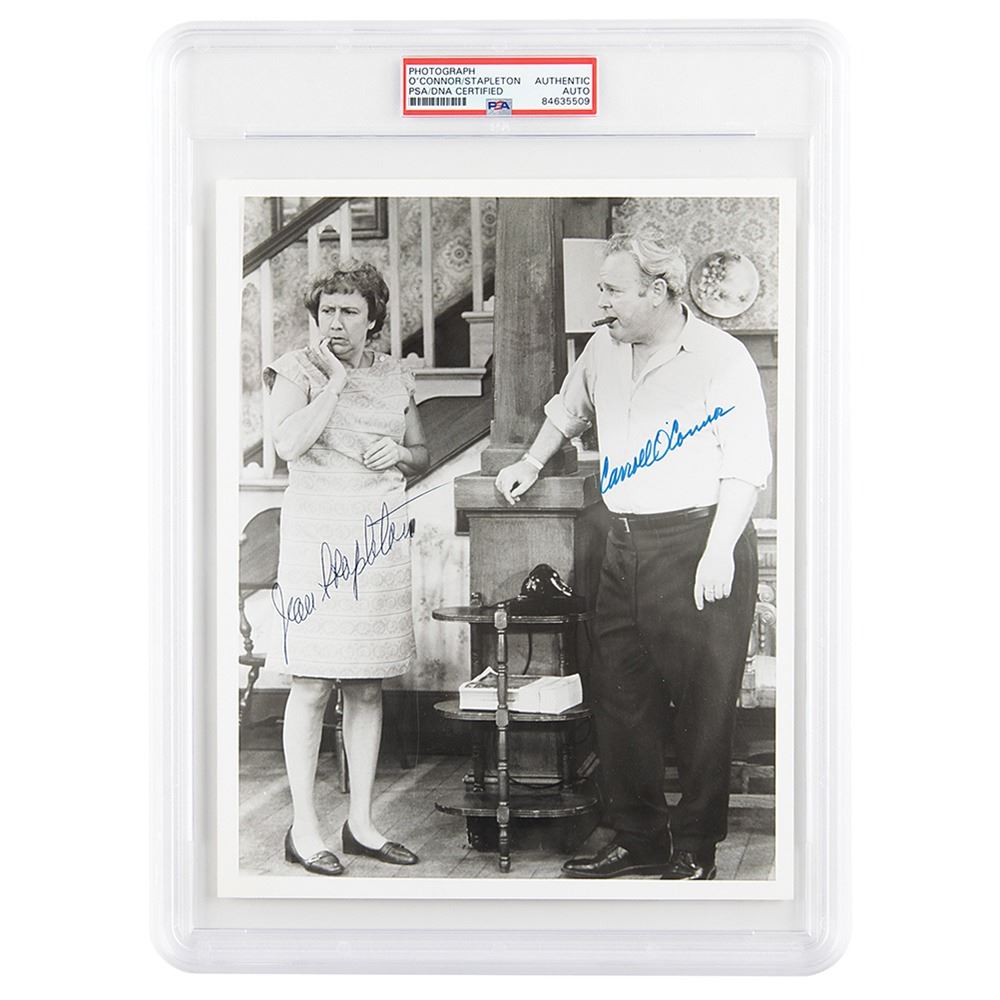 Matte-finish 8 x 10 photo of Archie and Edith Bunker from All in the Family, signed in blue felt tip by Carroll O'Connor and in black ballpoint by Jean Stapleton. In very fine condition. Encapsulated in a PSA/DNA authentication holder.