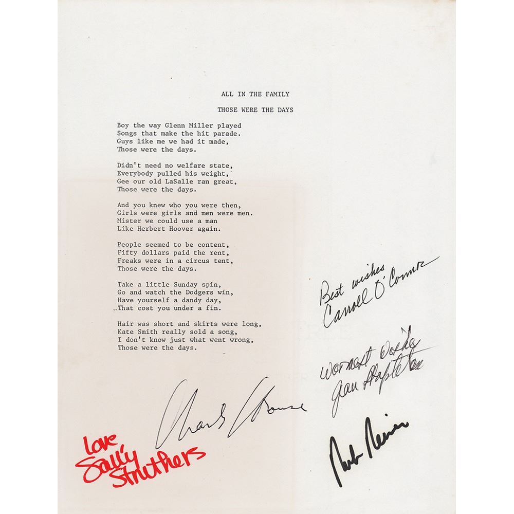 Souvenir typescript of the lyrics of 'Those Were the Days,' one page, 8.5 x 11, signed in ink by Carroll O'Connor, Jean Stapleton, Sally Struthers, Rob Reiner, and Charles Strouse. In fine condition. Accompanied by a full letter of authenticity from JSA.