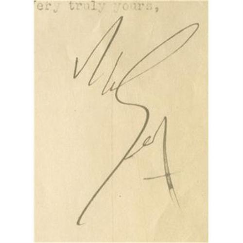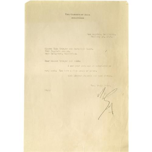 <B>Alla Nazimova Signed Letter.</B></I> A single page, typed letter on personal "Garden of Alla" stationery, dated February 24, 1927, and signed by the writer/actress in black fountain ink. Addressed to Ella Krieger and Josephine Wilde, it reads simply: "Dear Misses Krieger and Wilde: I saw your work and it interested me very much. You have a fine sense of color." In Very Fine condition with mild wear and mild to moderate tanning.<BR><BR><b>Shipping:</b> Flat Material, Small (<a target="_blank" href="http://www.heritageauctions.com/common/shipping.php">view shipping information</a>) <BR><BR><B>Important notice: