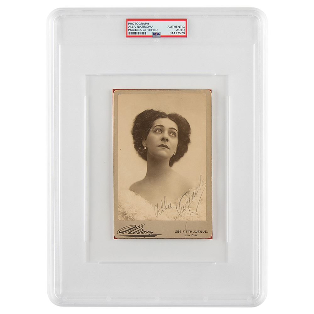 Scarce 4.25 x 6.5 cabinet portrait of Alla Nazimova in a tender, upward-glancing pose, signed in fountain pen. Published by the Otto Sarony Studio of New York. The card is affixed to a same-size mount. In fine condition, with a vertical crack through the address area of the mount. Encapsulated in a PSA/DNA authentication holder.