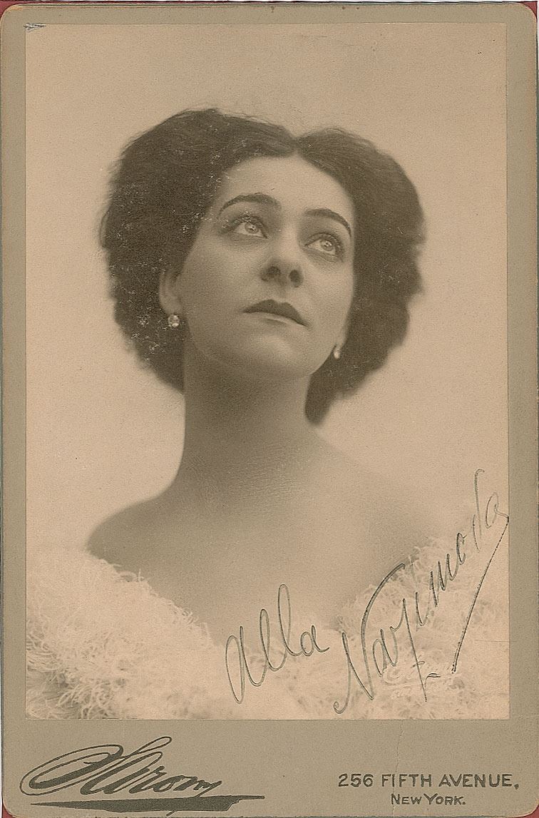Attractive 4.25 x 6.5 cabinet portrait of Alla Nazimova in a tender, upward-glancing pose, signed in fountain pen. Published by the Otto Sarony Studio of New York. The card is affixed to a same-size mount. In fine condition, with a vertical crack through the address area of the mount.