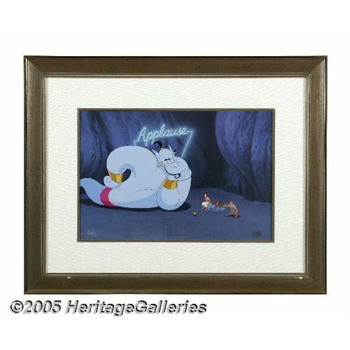 <B>Aladdin Limited Edition Hand-Painted Cel Set-Up #21/500 (The Walt Disney Company, 1993).</B></I> This recreated cel set-up, ""Applause,"" is from Sequence 11, Scene 110.2 of ""Aladdin"". Genie has been freed from the lamp by Aladdin and has just finished singing ""Friend Like Me!"" Disney artists have recreated this artwork from ""Aladdin"" using traditional animation techniques. Original animation drawings were transferred to acetate cels by a special six-step xerographic process. These cels were enhanced with hand-inked lines, and then hand-painted. This is number 21 from a limited edition of 500 hand-painted character cel set-ups. With an image area measuring 13"" x 10"", this cel set-up is in Excellent condition, and includes a certificate of authenticity. <BR><BR><B>Important notice:</B> Heritage usually auctions material at the rate of 200-250 lots per hour. On some occasions eBay Live bid software or the Internet may not be able to keep up with the pace of the auction. We recommend placing a realistic absentee bid now as insurance to avoid disappointment. Occasionally the auctioneer may eliminate or reject an eBay Live bid, and the auctioneer may also reopen a lot after the close of the eBay live bidding (usually because we missed an audience bid), and may reject your bid even if it shows you as the winning bidder. By bidding via eBay Live, you agree that Heritage may award the lot to another bidder at its sole discretion under the circumstances described above or any other reasonable circumstances. Since eBay bids are not shown to us until we open the lot on the floor, we treat those bids just like floor bids. In most cases the floor responds before the eBay bid is presented to us, due to Internet lag time, so for consistency we have made it a policy that floor bids are always considered first over tie eBay live bids. Also please note that all Heritage lots purchased through eBay Live carry a 20% Buyer's Premium. Please make sure you read the Terms and Co
