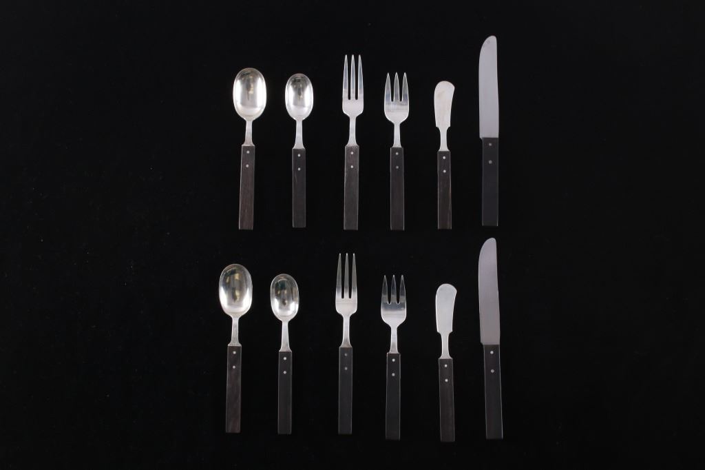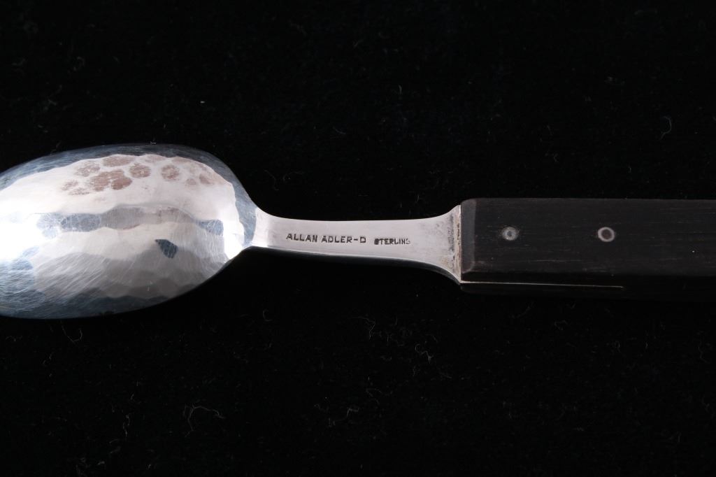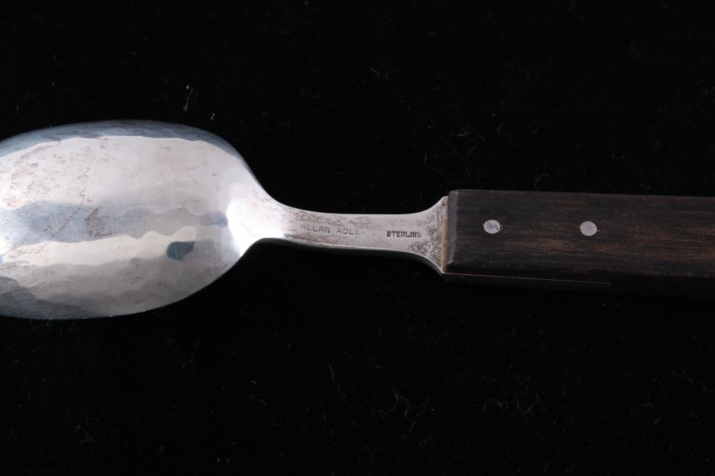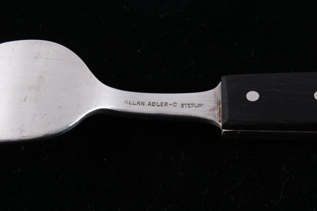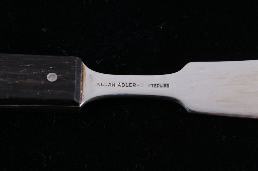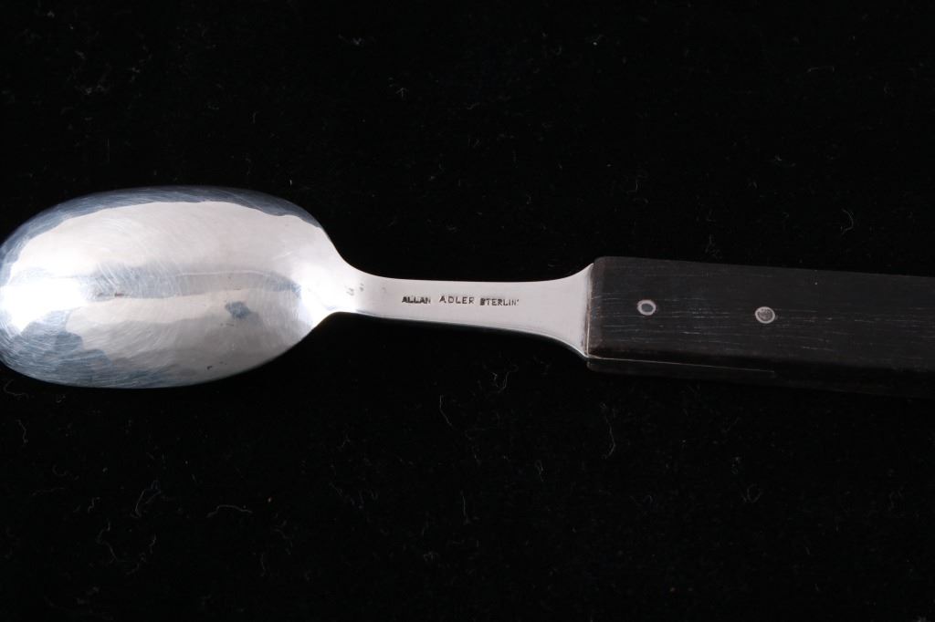 Featured in this lot is this Allan Adler sterling silver and ebony wooden silverware set. There are a total of ten pieces of silverware in this collection. There are two tea spoons, two table spoons, two stainless steel knives, two salad forks, two dinner forks, and two butter knives in this collection. The sterling silver utensils are mounted on ebony wood and shows hand hammered construction. The Allan Adler hallmark can be seen on the underside of the necks of the utensils with a 'sterling' stamp next to the hallmark. The silverware utensils feature soft sleeves The read Allan Adler Silversmiths - Hollywood California. The condition of this set of sterling silverware is good with a slight patina adorning some of the utensils but otherwise is in good overall condition. The measurements of these utensils range from 7" x 1" x 1/2" for the smallest utensil and 9" x 7/8" x 1/2" for the largest utensil. Allan Adler silverware is highly sought after and collectible silverware utensils.