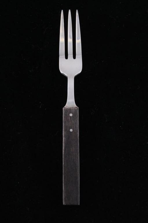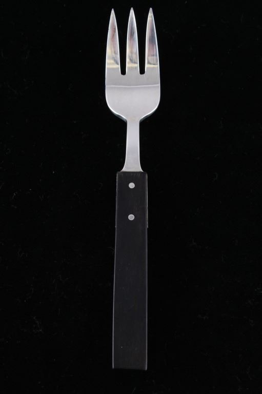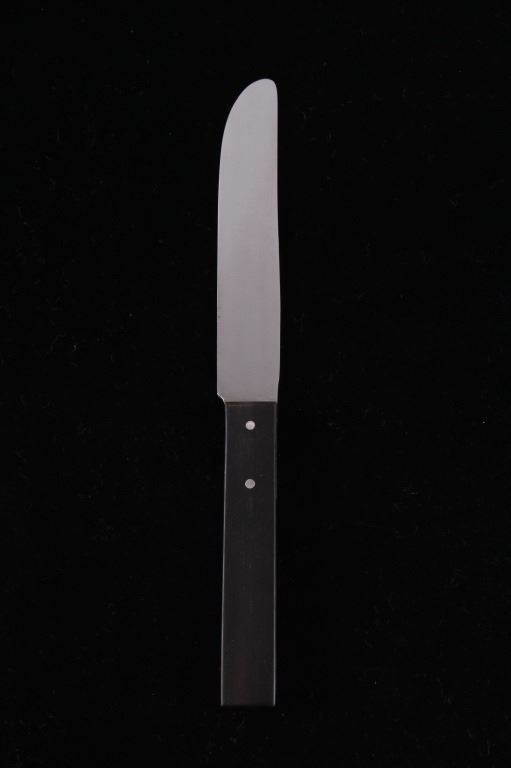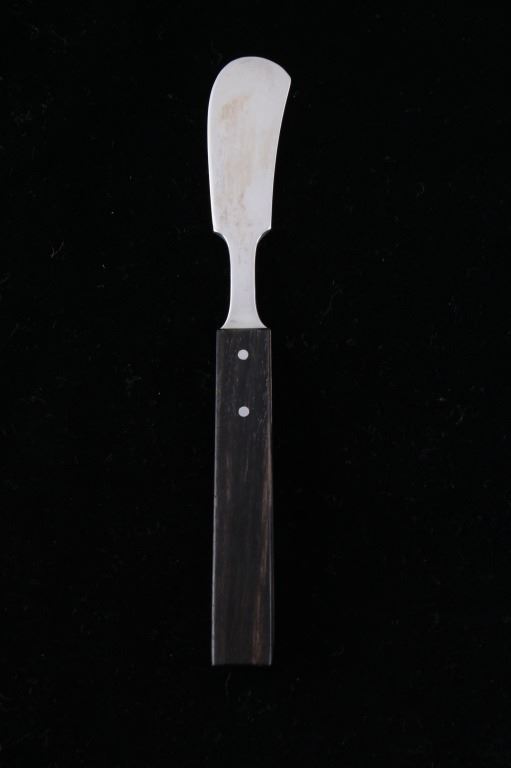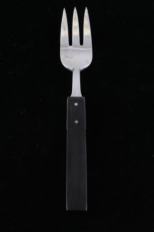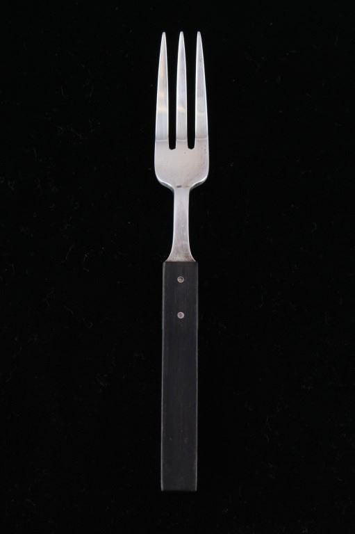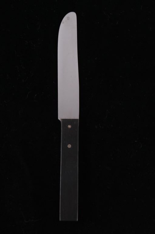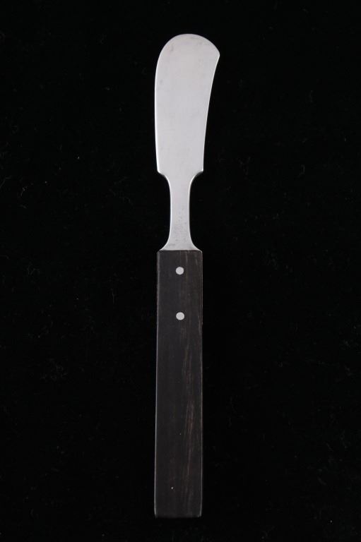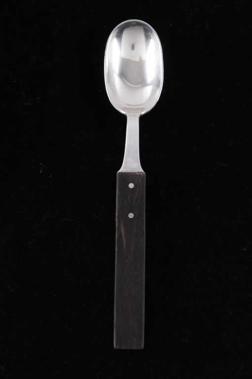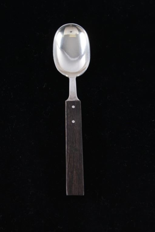 Featured in this lot is this Allan Adler sterling silver and ebony wooden silverware set. There are a total of ten pieces of silverware in this collection. There are two tea spoons, two table spoons, two stainless steel knives, two salad forks, two dinner forks, and two butter knives in this collection. The sterling silver utensils are mounted on ebony wood and shows hand hammered construction. The Allan Adler hallmark can be seen on the underside of the necks of the utensils with a 'sterling' stamp next to the hallmark. The silverware utensils feature soft sleeves The read Allan Adler Silversmiths - Hollywood California. The condition of this set of sterling silverware is good with a slight patina adorning some of the utensils but otherwise is in good overall condition. The measurements of these utensils range from 7" x 1" x 1/2" for the smallest utensil and 9" x 7/8" x 1/2" for the largest utensil. Allan Adler silverware is highly sought after and collectible silverware utensils.