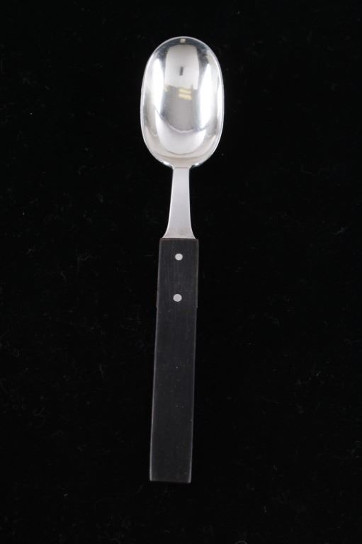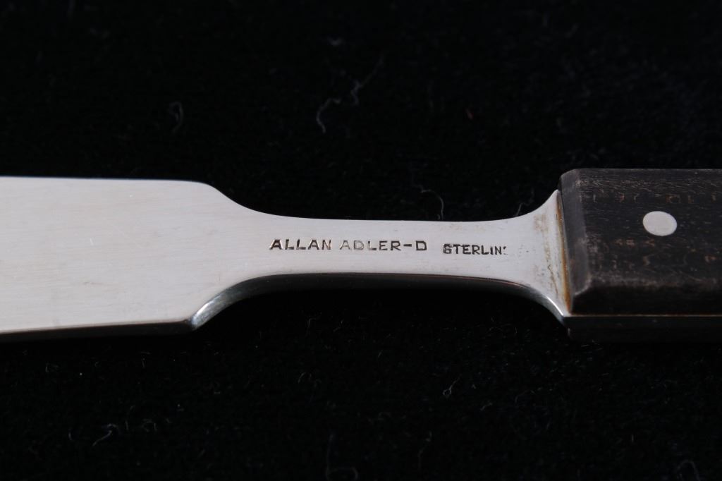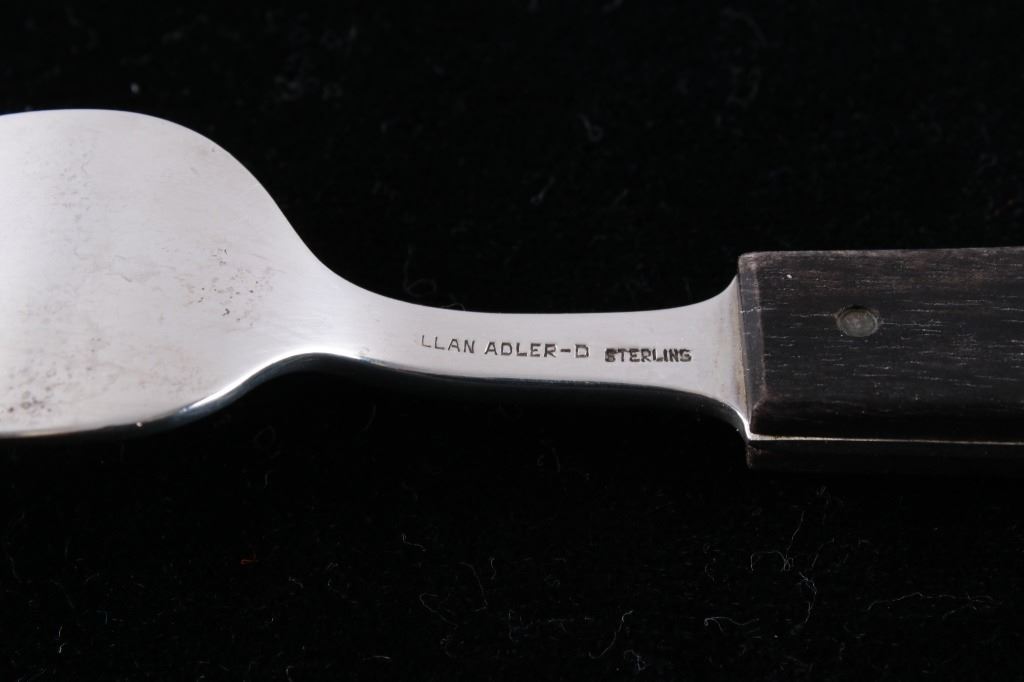 Featured in this lot is this Allan Adler sterling silver and ebony wooden silverware set. There are a total of ten pieces of silverware in this collection. There are two tea spoons, two table spoons, two stainless steel knives, two salad forks, two dinner forks, and two butter knives in this collection. The sterling silver utensils are mounted on ebony wood and shows hand hammered construction. The Allan Adler hallmark can be seen on the underside of the necks of the utensils with a 'sterling' stamp next to the hallmark. The silverware features soft sleeves that is marked Allan Adler Silversmith - Hollywood California. The condition of this set of sterling silverware is good with some chipping to the larger knives due to use and wear in good overall condition. The measurements of these utensils range from 7" x 1" x 1/2" for the smallest utensil and 9" x 7/8" x 1/2" for the largest utensil. Allan Adler silverware is highly sought after and collectible silverware utensils.