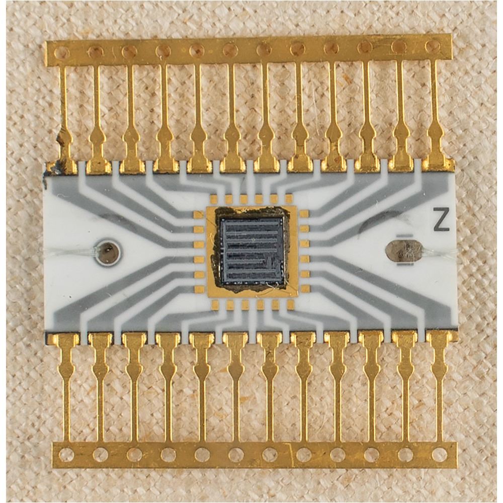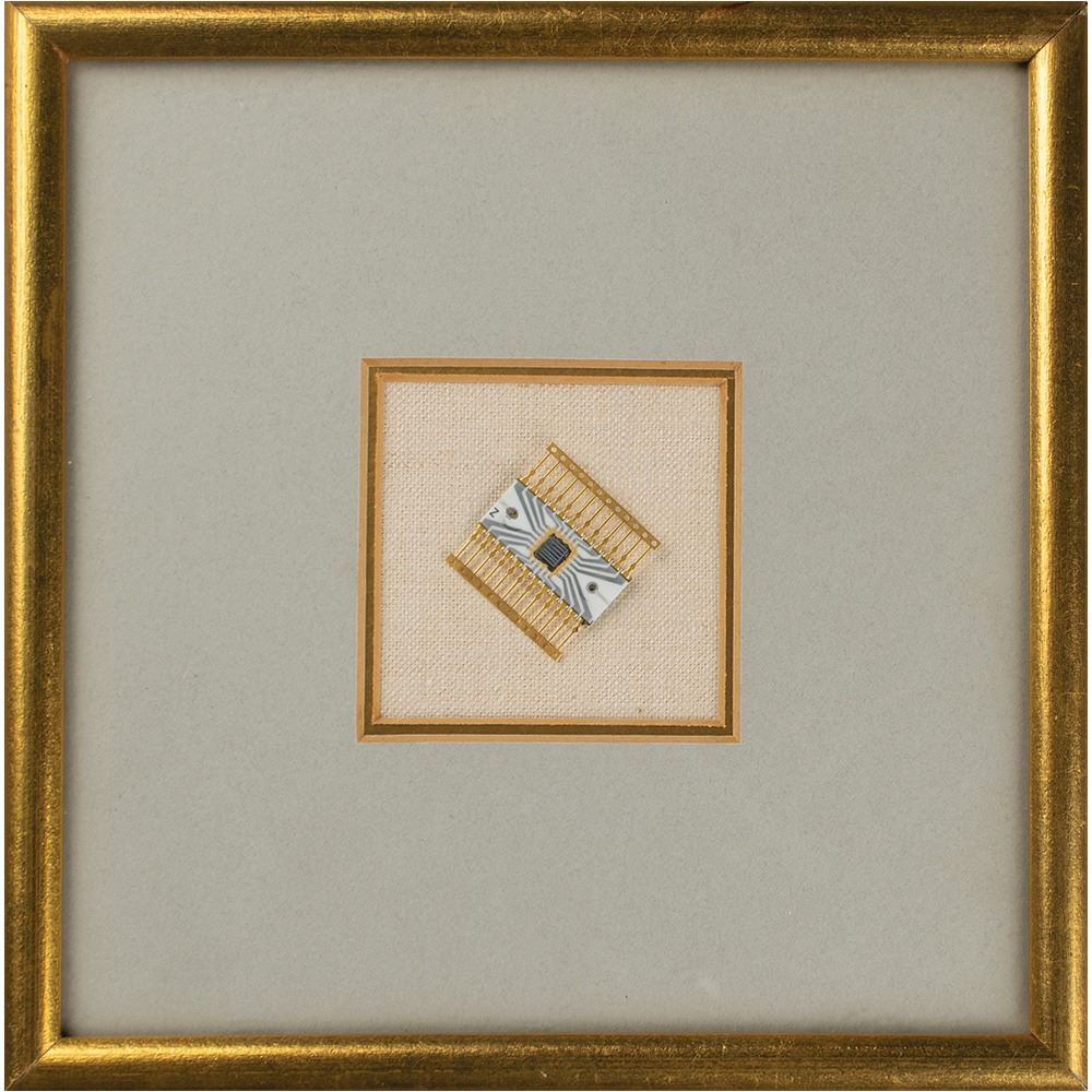 Unique prototype of the 'Home Pong' chip given to Pong creator Allan Alcorn by his team as a memento of their work to reduce the hard-wired, arcade cabinet version of the video game to a smaller, affordable single chip for consumer-level use at home. Originating from the first prototype run, it is an N-channel, enhancement mode, CMOS chip that runs at 3 MHz, mounted on a ceramic lead frame used only on the prototype run. The carrier is mounted, matted, and framed to an overall size of 8.75 x 8.75. In fine condition.