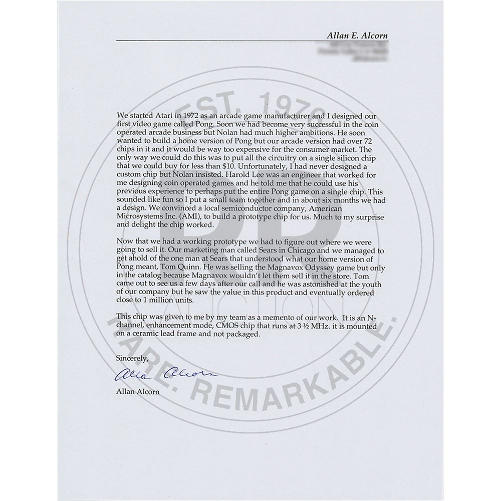 Accompanied by a letter of provenance signed by Alcorn, discussing the initial success of the Pong arcade game and Atari's efforts to create a commercial, consumer version of the gamewhich hinged upon the production of this small, affordable chip to replace the expensive hard-wired PCBs of the arcade version. In part: "We started Atari in 1972 as an arcade game manufacturer and I designed our first video game called Pong. Soon we had become very successful in the coin operated arcade business but Nolan had much higher ambitions. He soon wanted to build a home version of Pong but our arcade version had over 72 chips in it and it would be way too expensive for the consumer market. The only way we could do this was to put all the circuitry on a single silicon chip that we could buy for less than $10. Unfortunately, I had never designed a custom chip but Nolan insisted. Harold Lee was an engineer that worked for me designing coin operated games and he told me that he could use his previous experience to perhaps put the entire Pong game on a single chip. This sounded like fun so I put a small team together and in about six months we had a design. We convinced a local semiconductor company, American Microsystems Inc. (AMI), to build a prototype chip for us. Much to my surprise and delight the chip worked.