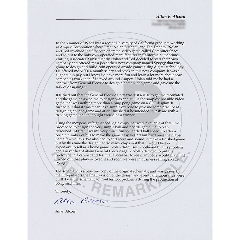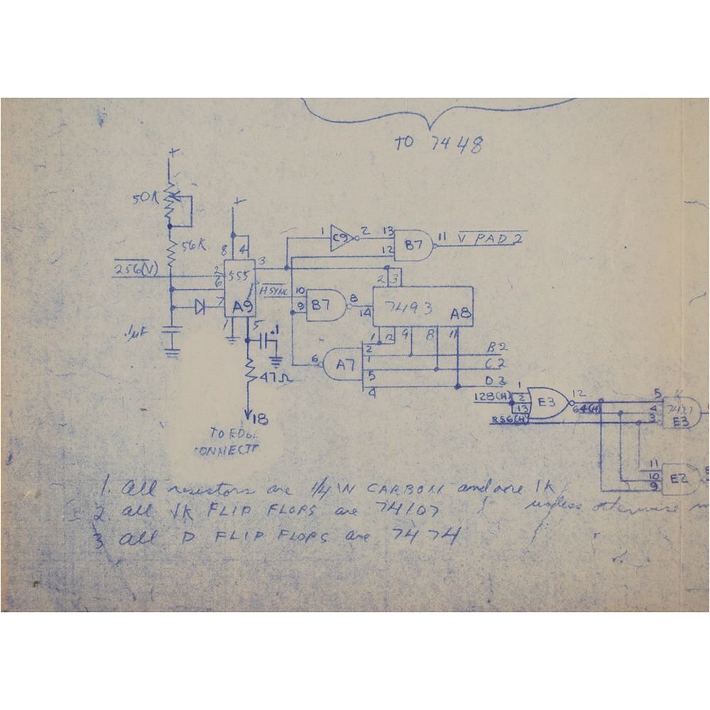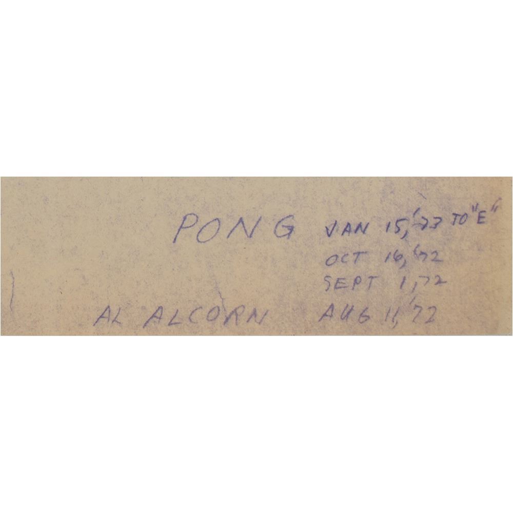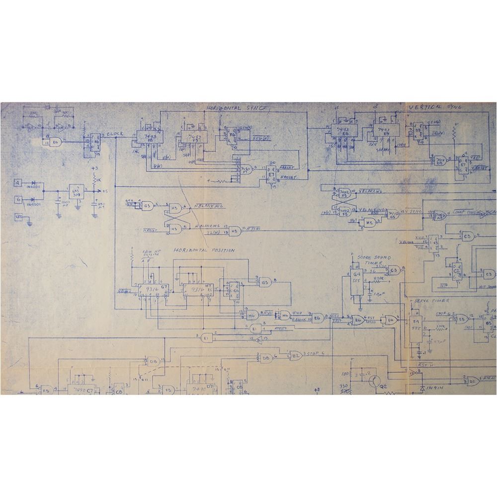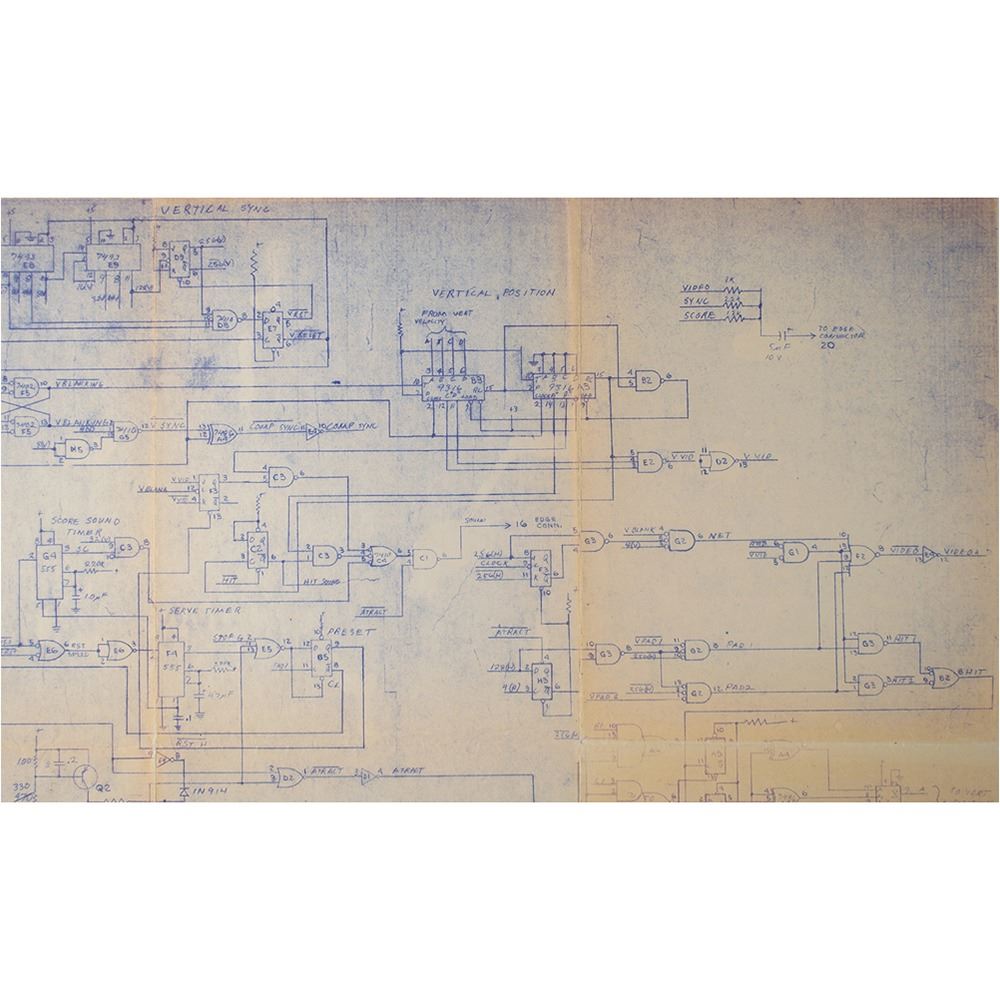 Original blue line copy of the Pong schematic originally drawn by Allan Alcorn, one page, 34 x 22, identified in the lower corner, "Pong, Al Alcorn," with a listing of descending revision dates: "Jan 15, '73 to 'E,' Oct 16, '72, Sept 1, '72, Aug 11, '72." Major sections of the schematicareas of the circuit responsible for video generationare labeled "Horizontal Sync," "Horizontal Position," "Vertical Sync," and "Vertical Position," while some other noteworthy areas are marked: "Score Sound Timer," "Hit Sound," and "Coin Switch." Notes in the lower left state: "1. All resistors are 1/4 W Carbon and are 1K unless otherwise stated, 2. All JK flip flops are 74107, 3. All D flip flops are 7474." Folded and in fine condition, with light overall toning. Accompanied by a letter of provenance signed by Alcorn, discussing his history as Atari's first hired employee and the story behind his creation of Pong; he used this schematic to troubleshoot problems during the production of Pong arcade games.