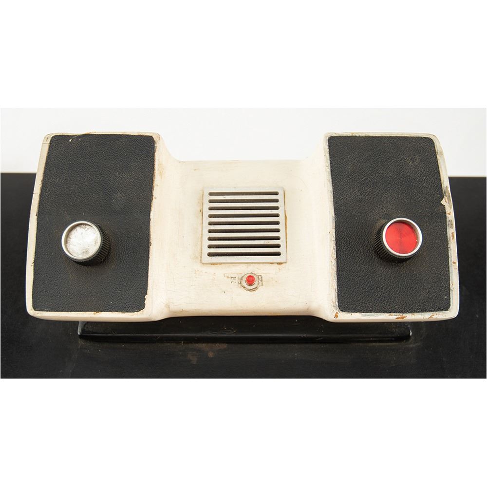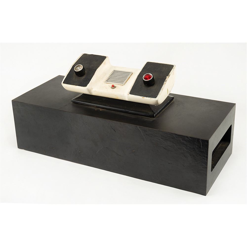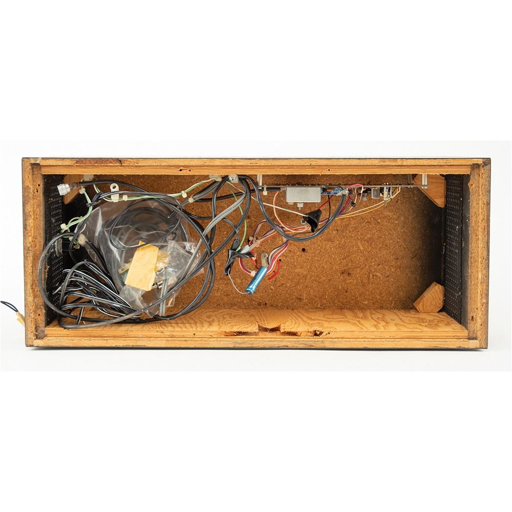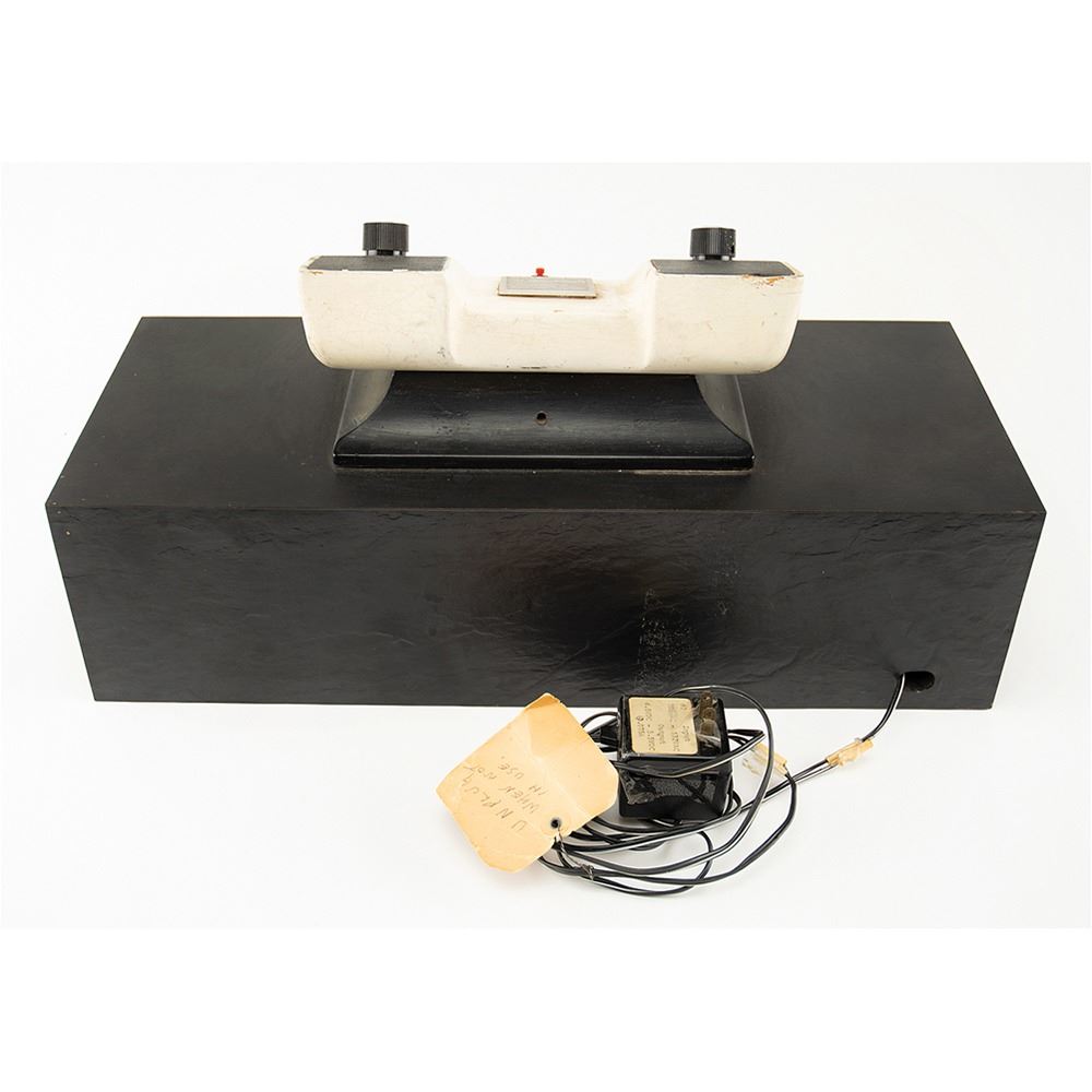 Original prototype of an Atari 'Home Pong' unit built with a finished Pong chip in a prototype circuit board in the base, measuring 20 x 9.5 x 8.25, featuring a hand-carved wooden mockup of the Pong system set upon the large black box. The system mock-up features two potentiometer paddle control knobs, a red 'start game' pushbutton, and a central metal grille for its built-in speaker. The general design cues seen herefrom the three-part layout to the gently angled control panel surfacesare reflected in the production models of 'Home Pong,' beginning with the Sears Tele-Games (1975) and subsequent Atari Pong Model C-100 (1976). The box, which has the electronics concealed inside, is powered by an AC adapter and has an on/off toggle switch on one side. This was the second of two Pong prototypes built by Atari that could be taken to show to potential customers: the chip fabrication had been set up and finalized, but the plastic cases were still in limbo. However, this 'black box' prototype offered an accurate idea of the look, feel, and function of the finished product.