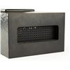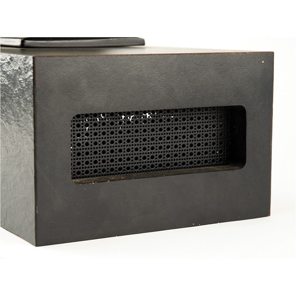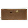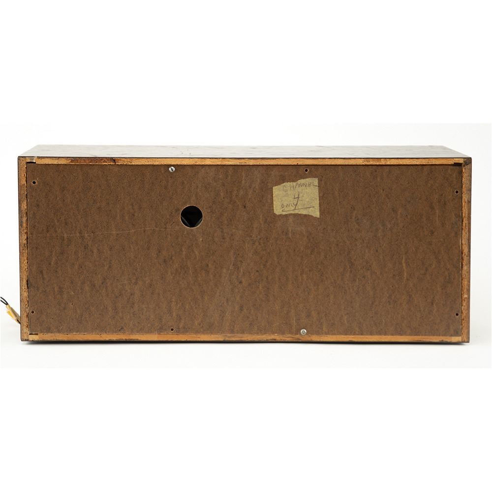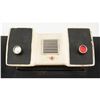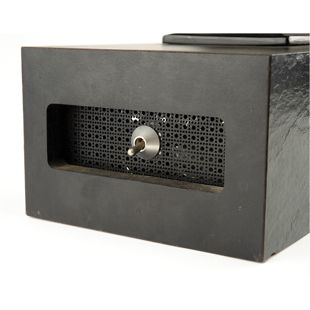 Original prototype of an Atari 'Home Pong' unit built with a finished Pong chip in a prototype circuit board in the base, measuring 20 x 9.5 x 8.25, featuring a hand-carved wooden mockup of the Pong system set upon the large black box. The system mock-up features two potentiometer paddle control knobs, a red 'start game' pushbutton, and a central metal grille for its built-in speaker. The general design cues seen herefrom the three-part layout to the gently angled control panel surfacesare reflected in the production models of 'Home Pong,' beginning with the Sears Tele-Games (1975) and subsequent Atari Pong Model C-100 (1976). The box, which has the electronics concealed inside, is powered by an AC adapter and has an on/off toggle switch on one side. This was the second of two Pong prototypes built by Atari that could be taken to show to potential customers: the chip fabrication had been set up and finalized, but the plastic cases were still in limbo. However, this 'black box' prototype offered an accurate idea of the look, feel, and function of the finished product.