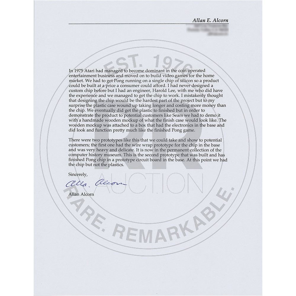 Accompanied by a letter of provenance signed by Alcorn, discussing the initial success of the Pong arcade game and Atari's efforts to create a commercial, consumer version of the gamewhich hinged upon the production of a small, affordable chip to replace the expensive hard-wired PCBs of the arcade version. As it turned out, the fabrication of a functional chip was 'easy'it was getting an injection molded plastic case for the system that was the main challenge in putting Pong in homes across America.