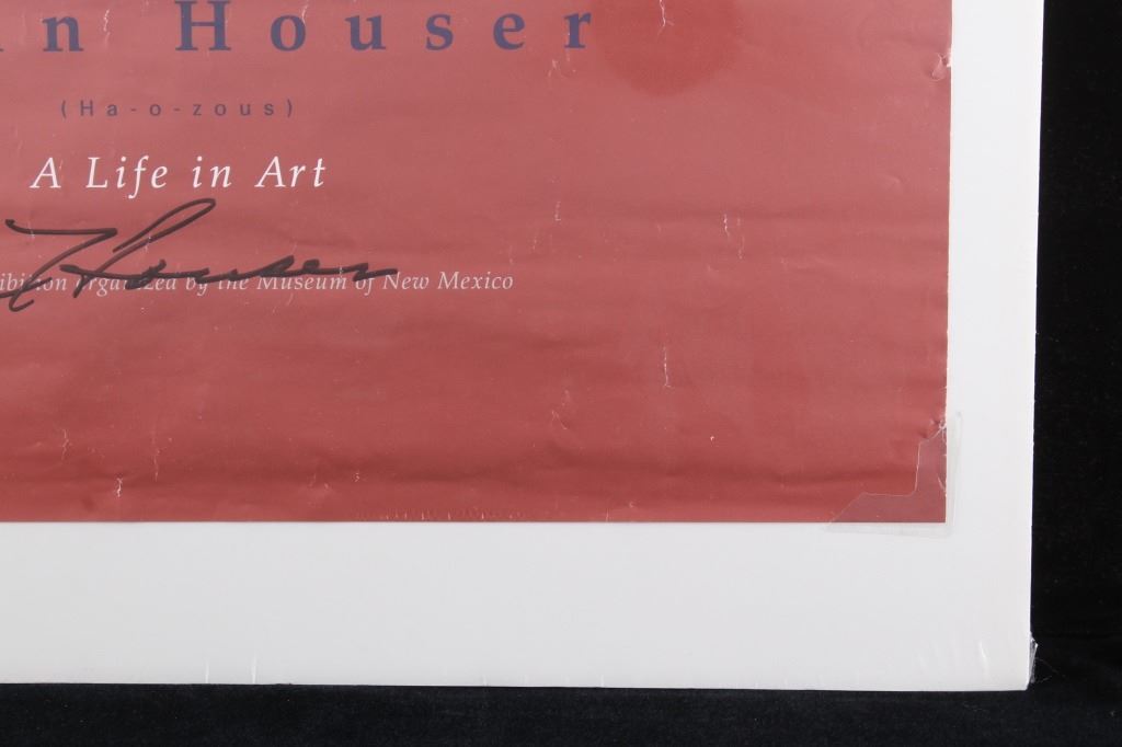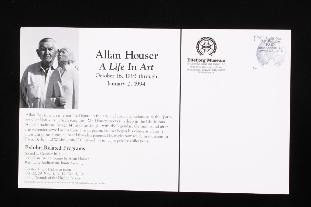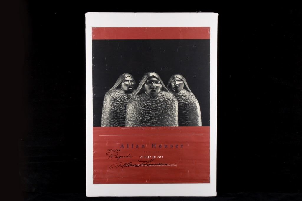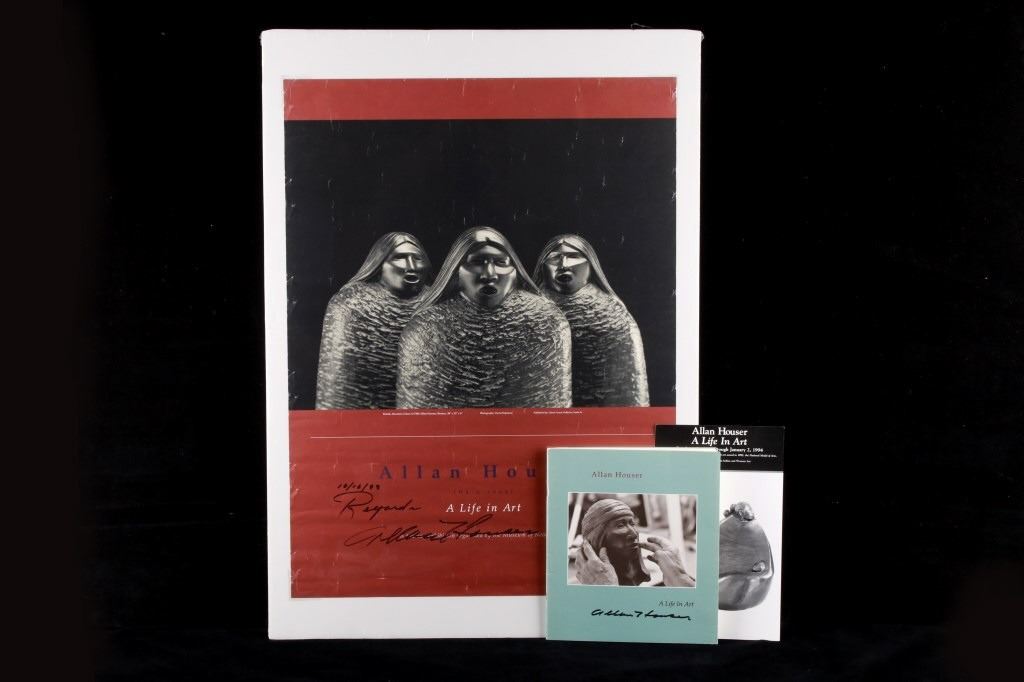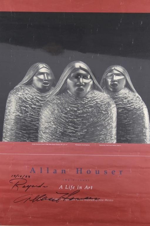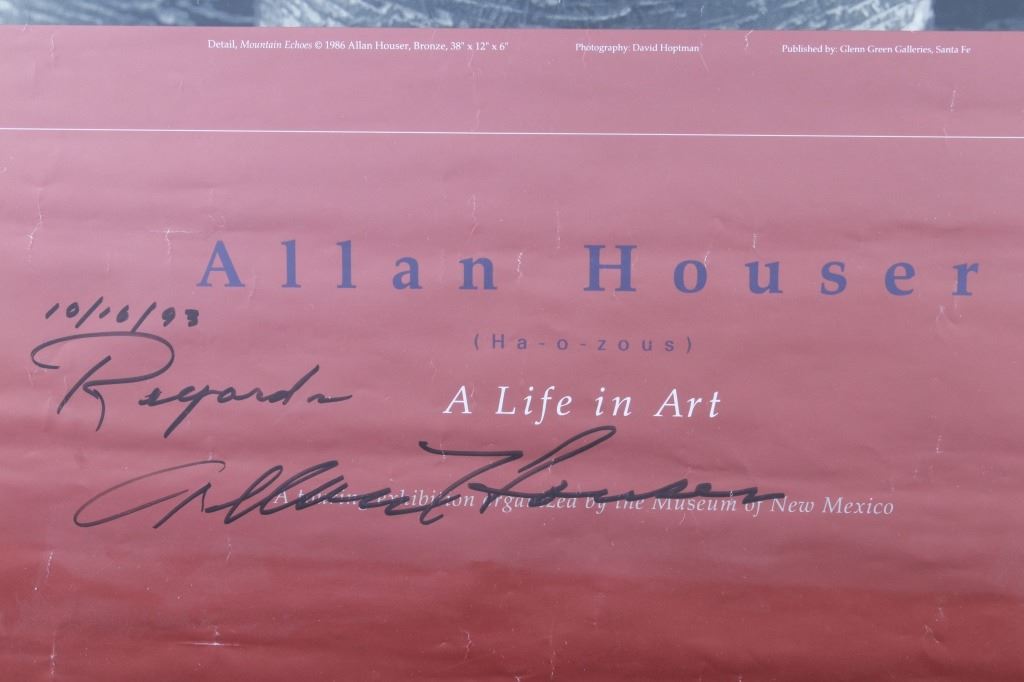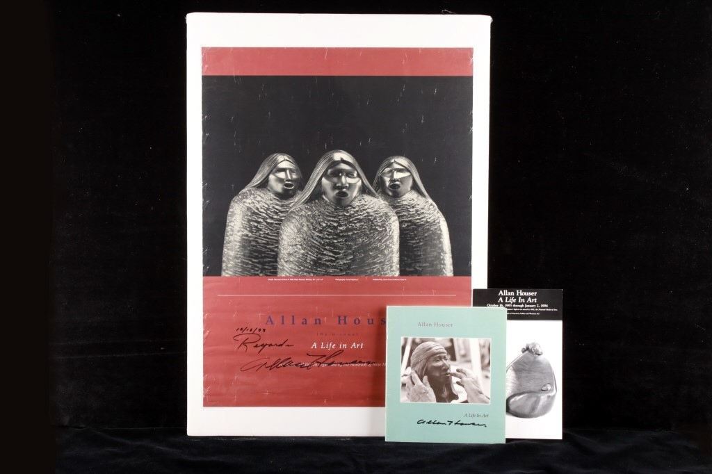 The lot features an original Allan Houser signed print 1993 show “A Life in Art” poster, original Allan Houser program that has been signed on the cover and an advertising post card with “Mothers Blessing” on the front. Allan Capron Houser (1914 – 1994) was a Chiricahua Apache sculptor, painter and book illustrator born in Oklahoma. He was one of the most renowned Native American painters and Modernist sculptors of the 20th century. Houser's work can be found at the Smithsonian Museum of American Art, the National Museum of the American Indian, the National Portrait Gallery in Washington, D.C., and in numerous major museum collections throughout North America, Europe and Japan. Additionally, Houser's Offering of the Sacred Pipe is on display at United States Mission to the United Nations in New York City. his collection consists of items from his 1993 show "A Life In Art". First is a program that has been signed on the cover in black marker. The program measures 9" x 8" and has 32 pages. Next is a advertising post card that measures 10" x 6" and has his famous sculpture "Mothers Blessing". The last item in the collection is a poster showing "Mountain Echoes" for the A Life In Art showing at the Museum of New Mexico. The poster is signed "10-16-93 Regards Allan Houser". The poster measures 24" x 18" with some wear.