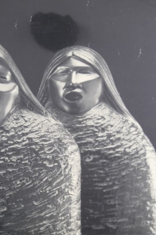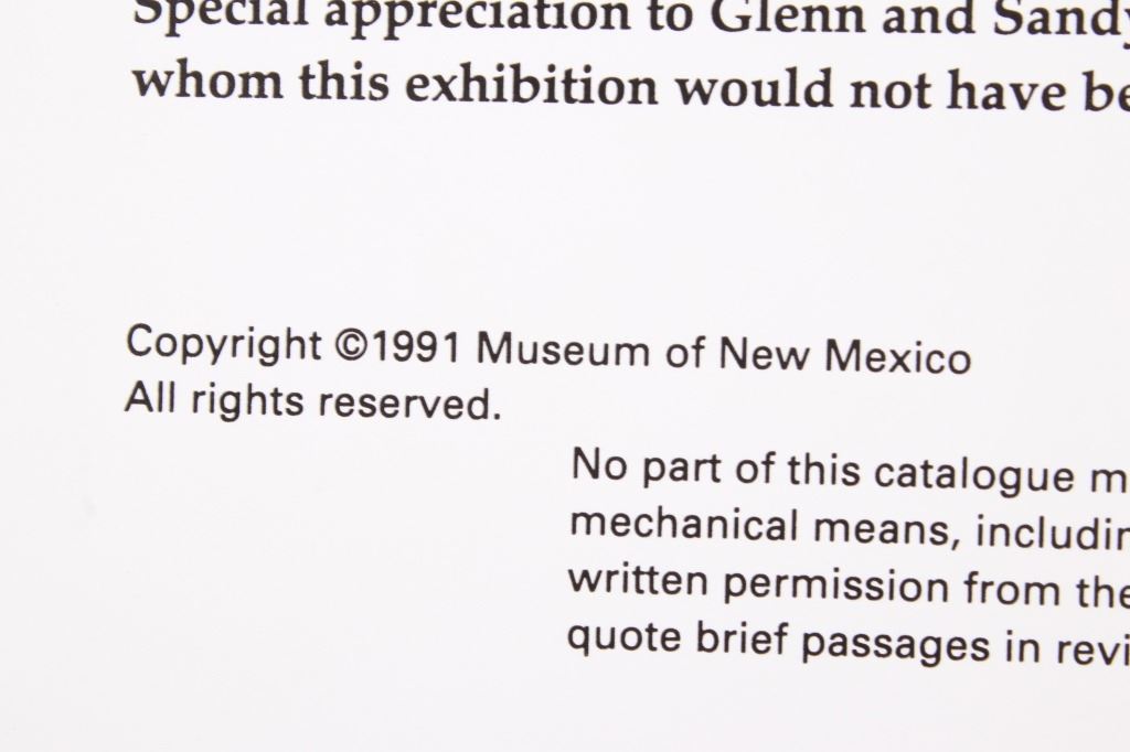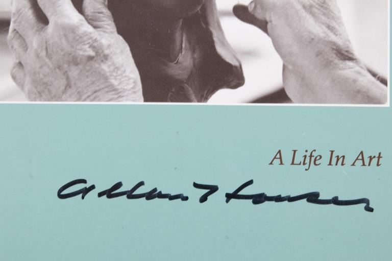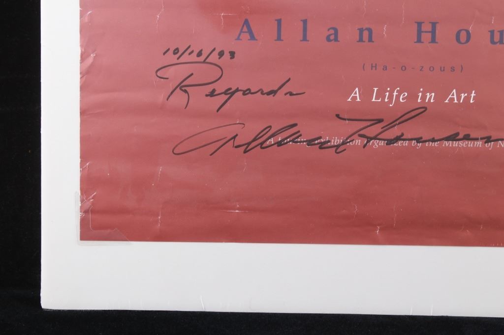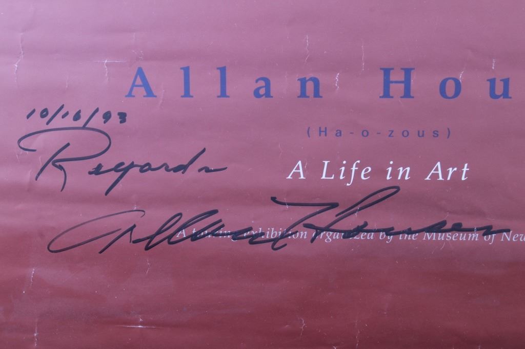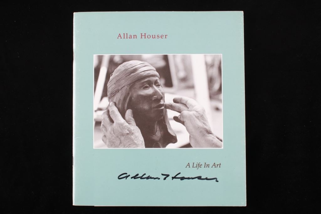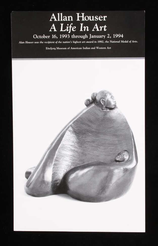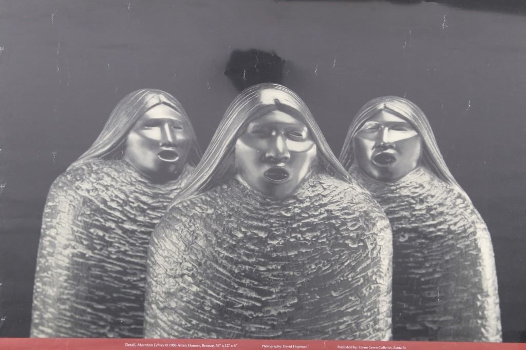 The lot features an original Allan Houser signed print 1993 show “A Life in Art” poster, original Allan Houser program that has been signed on the cover and an advertising post card with “Mothers Blessing” on the front. Allan Capron Houser (1914 – 1994) was a Chiricahua Apache sculptor, painter and book illustrator born in Oklahoma. He was one of the most renowned Native American painters and Modernist sculptors of the 20th century. Houser's work can be found at the Smithsonian Museum of American Art, the National Museum of the American Indian, the National Portrait Gallery in Washington, D.C., and in numerous major museum collections throughout North America, Europe and Japan. Additionally, Houser's Offering of the Sacred Pipe is on display at United States Mission to the United Nations in New York City. his collection consists of items from his 1993 show "A Life In Art". First is a program that has been signed on the cover in black marker. The program measures 9" x 8" and has 32 pages. Next is a advertising post card that measures 10" x 6" and has his famous sculpture "Mothers Blessing". The last item in the collection is a poster showing "Mountain Echoes" for the A Life In Art showing at the Museum of New Mexico. The poster is signed "10-16-93 Regards Allan Houser". The poster measures 24" x 18" with some wear.