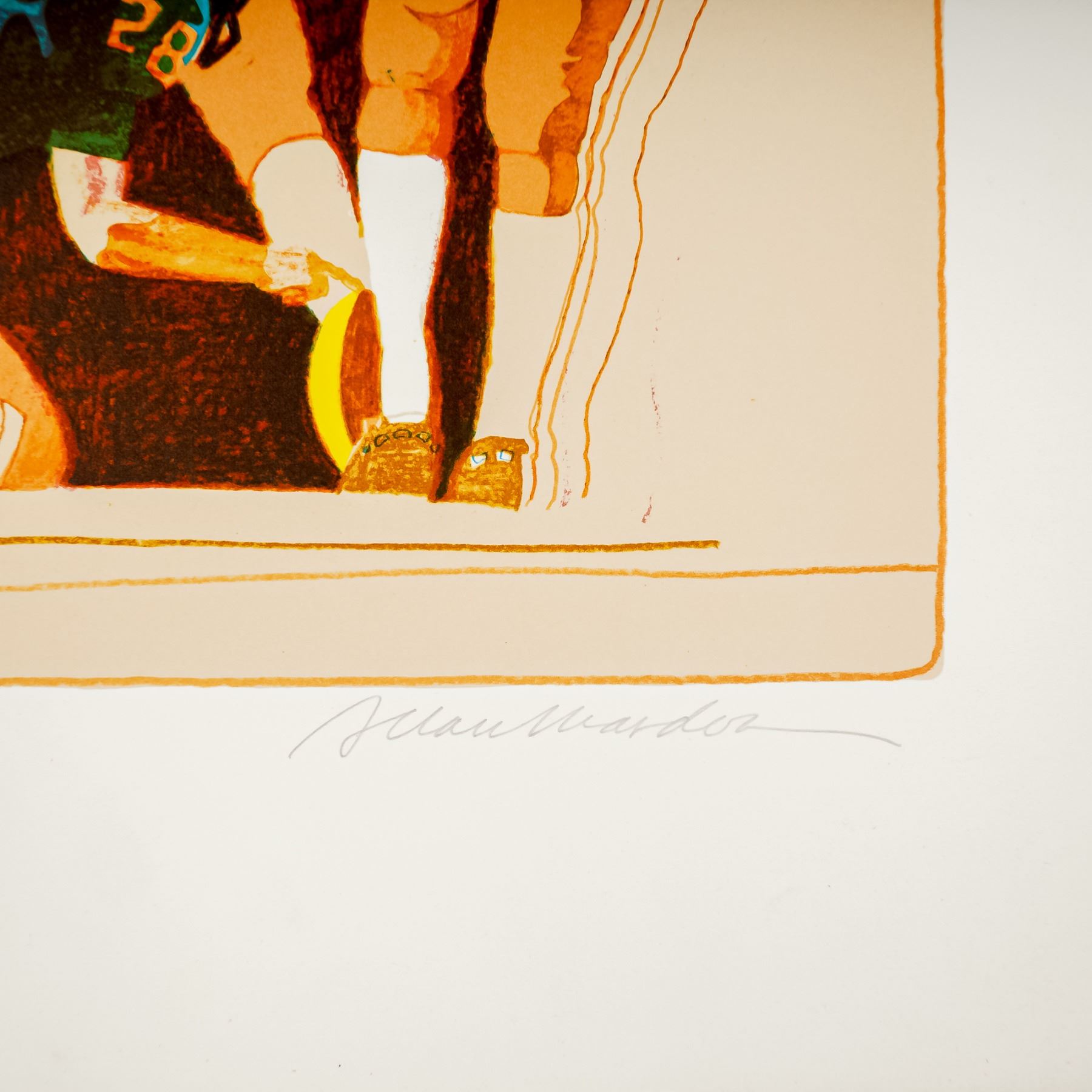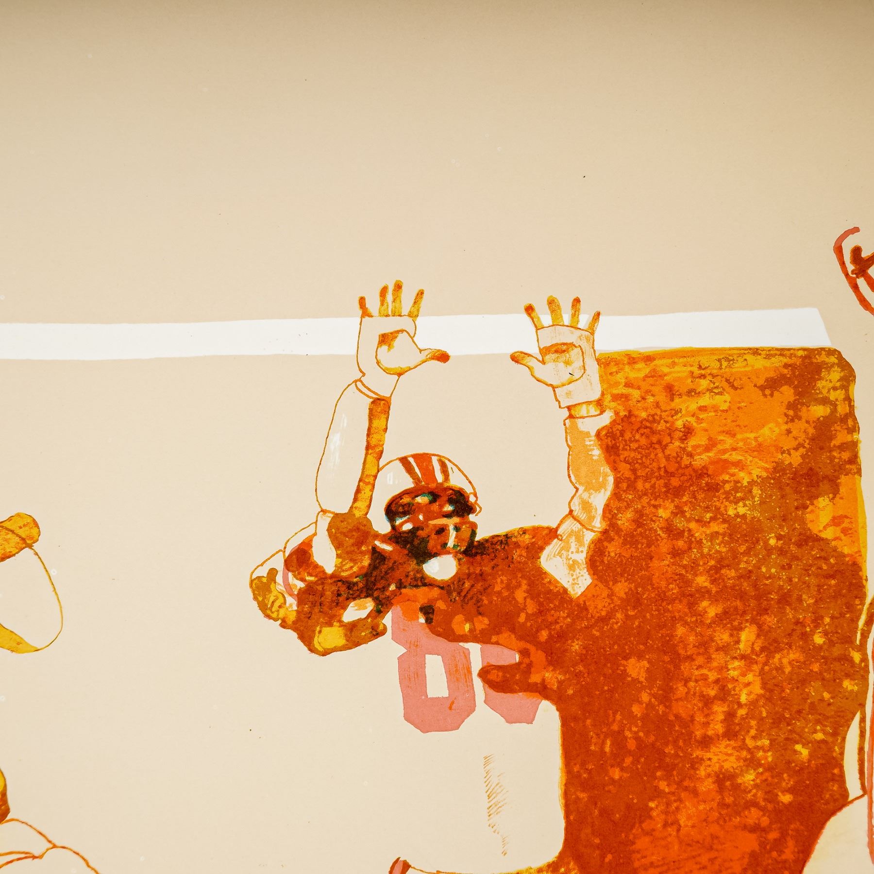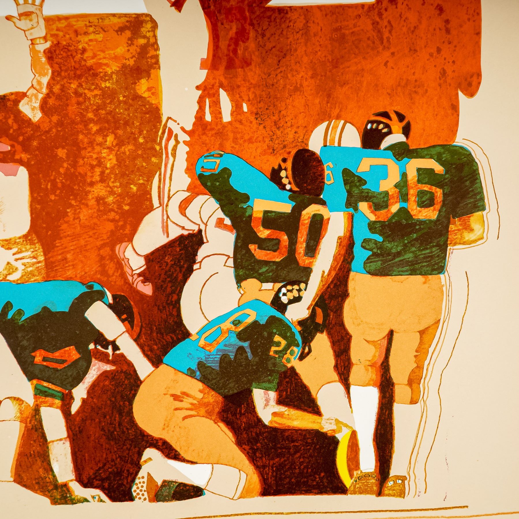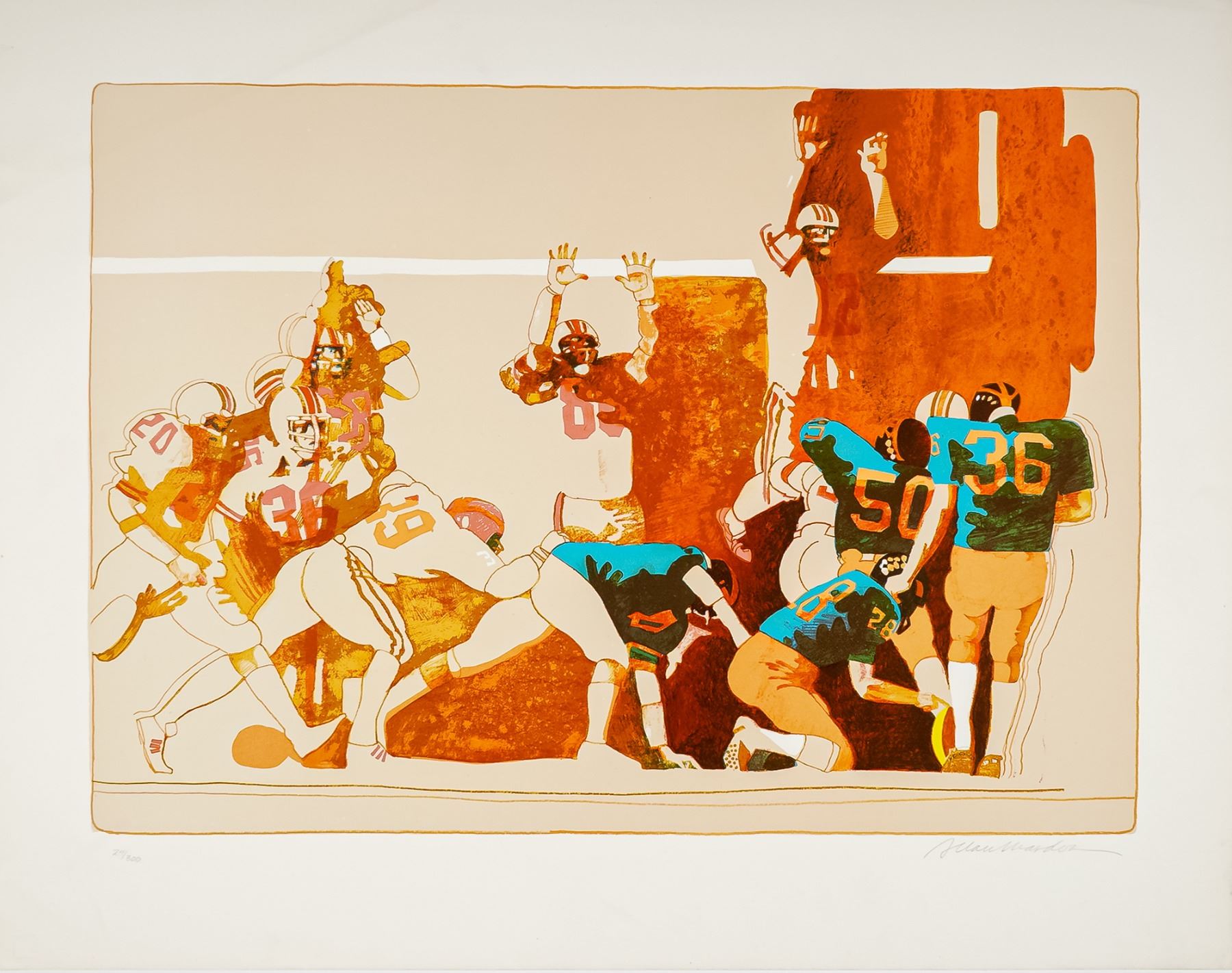 Dynamic and vibrant lithograph on paper by Allan Mardon, renowned for his bold use of color and layered compositions that bring energy and movement to the forefront. This limited edition work captures the intensity of NFL football with players colliding in a dramatic end zone moment. The scene bursts with action and tension, perfectly reflecting Mardon's celebrated ability to blend sports and storytelling through art. Hand signed by the artist in pencil on the lower right and numbered 24/300.