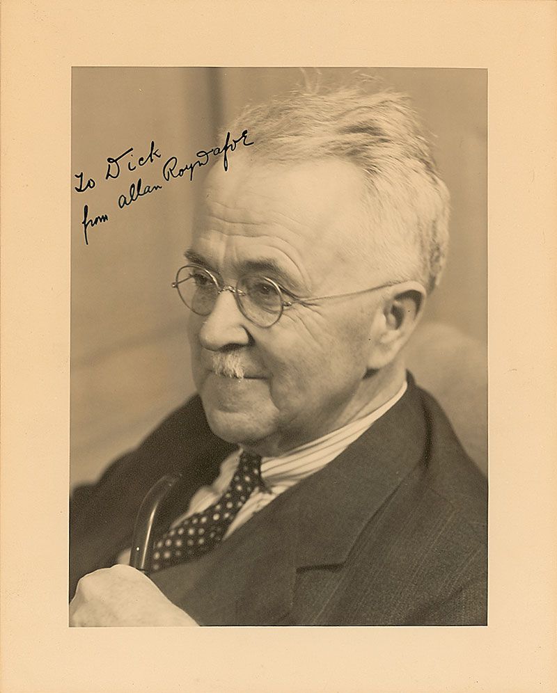 Canadian doctor (1883–1943) who delivered the famed Dionne quintuplets in Ontario in 1934. Vintage matte-finish 8 x 10 head-and-shoulders portrait, signed and inscribed in fountain pen, “To Dick, from Allan Roy Dafoe.” In fine condition, with a few light creases to borders.