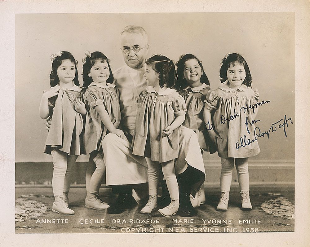 Canadian doctor (1883–1943) who delivered the famed Dionne quintuplets in Ontario in 1934. Vintage matte-finish 10 x 8 photo of Dafoe posing with the quintuplets dated 1938, signed and inscribed in fountain pen, “To Dick Hyman, from Allan Roy Dafoe.” In fine condition.