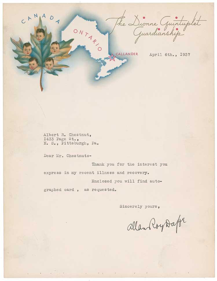 Canadian doctor who delivered the famed Dionne quintuplets in Ontario in 1934. TLS, one page, 8.25 x 10.75, colorful Dionne Quintuplet Guardianship letterhead, Ontario, April 6, 1937. Dafoe sends his autographs and thanks for “the interest you express in my recent illness and recovery.” In fine condition, with a line of pin holes to the bottom, and some light soiling and wrinkling. Terrific letterhead! RRAuction COA.