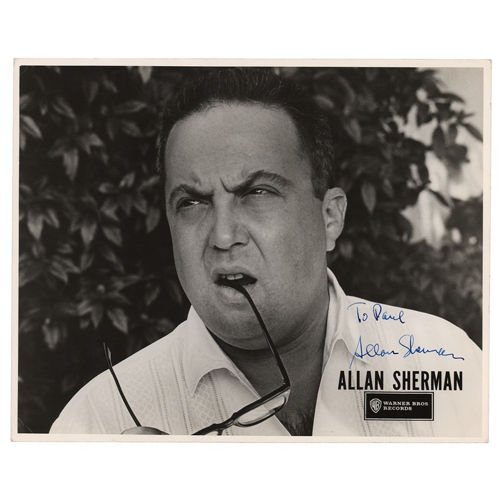 Vintage matte-finish 10 x 8 Warner Bros. Records publicity photo of Sherman with his glasses in his mouth, signed and inscribed in blue fountain pen, "To Paul, Allan Sherman.†Reverse bears a Decca Records credit stamp. In fine condition, with small corner creases.
