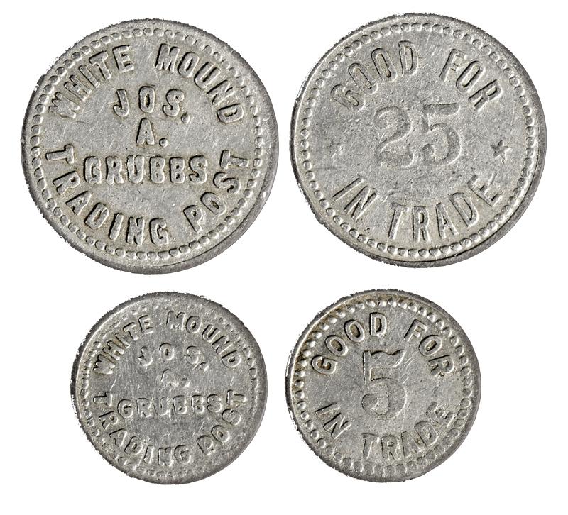 Lot of two tokens: obverse: White Mound / Jos. / A. / Grubbs / Trading Post; reverse: Good For / 5, 25 / In Trade. Al, 20,27mm, R6,R7. Fine condition.
