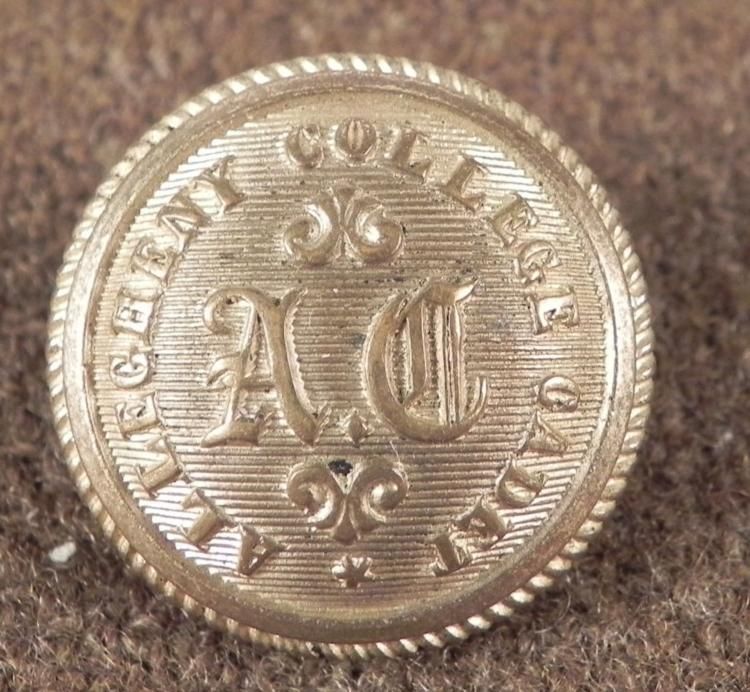 Allegheny College Antique Military Cadet Coat Button * * Obverse: ALLEGHENY COLLEGE CADET A.C., on horizontal groove pattern Reverse: SHANNON, MILLER & GRANE, N.Y.Diameter: 23 mmCondition: Excellent