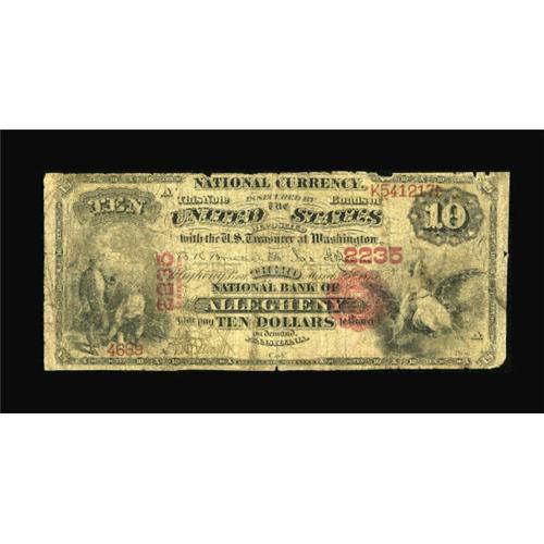 <B>Allegheny, PA</B></I> - $10 1875 Fr. 420 <B>The Third NB</B></I> Ch. # 2235<BR> A very scarce Allegheny County issuer with but three large known in the Kelly census. This becomes the second First Charter $10 reported. Though well circulated with some margin imperfections and minor holes, it is mostly intact with the cashier's pen signature remaining. <B>Good-Very Good</B></I>.<BR><BR><b>Shipping:</b> Coins & Currency (<a target="_blank" href="http://www.heritageauctions.com/common/shipping.php">view shipping information</a>)