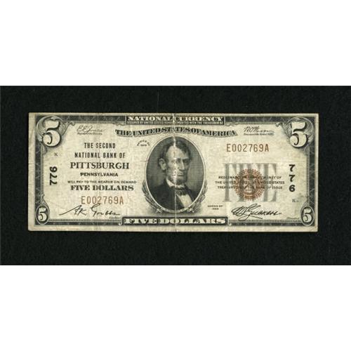 <B>Pittsburgh, PA - </B></I>$5 1929 Ty. 1<B> The Second NB </B></I>Ch. # 776<B></B></I><BR> Only four small size notes are known from this issuer under its third title. A heavy fold has disturbed the portrait area a bit. <B>Very Good</B></I>.<BR><BR><b>Shipping:</b> Coins & Currency (<a target="_blank" href="http://www.heritageauctions.com/common/shipping.php">view shipping information</a>)