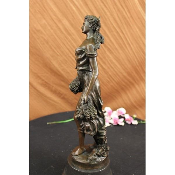 This bronze statue and cast in the traditional Lost Wax Casting Process. This ensures a quality bronze sculpture that may be passed down from generation to generation. This is a beautiful statue of a young girl out-picking grapes for someone she loves. By looking at her wardrobe, she is out harvesting before the winter months come and brings all the cold weather. Dimensions: Height 19 X Width 6 inches. Weight: 20 LBS.