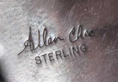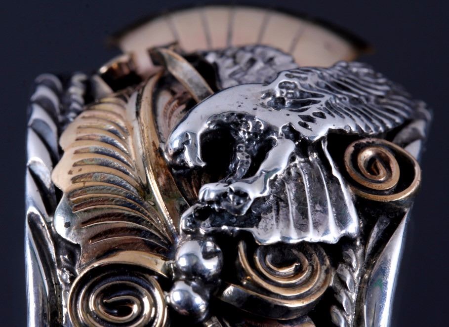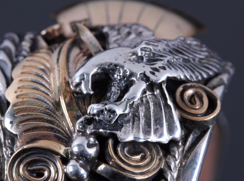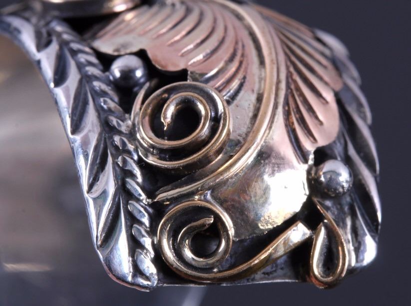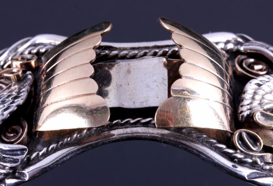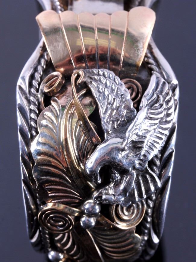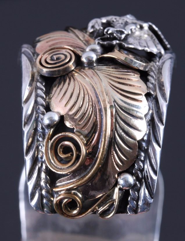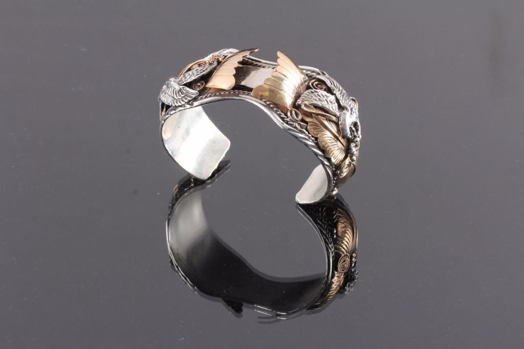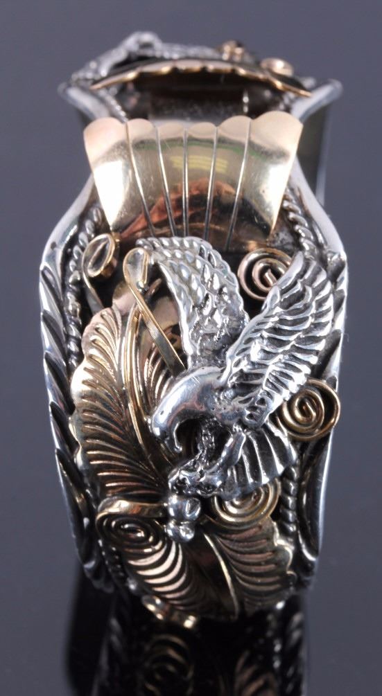 This is a Navajo sterling silver and gold watch cuff made by Allen Chee. The piece shows an eagle on each side flanked by gold leaves and scrollwork accents. The back of the cuff is marked "Allen Chee Sterling". The Navajo watch cuff is in very good condition. It measures 2" x 2.75" and is 1.25" wide.
