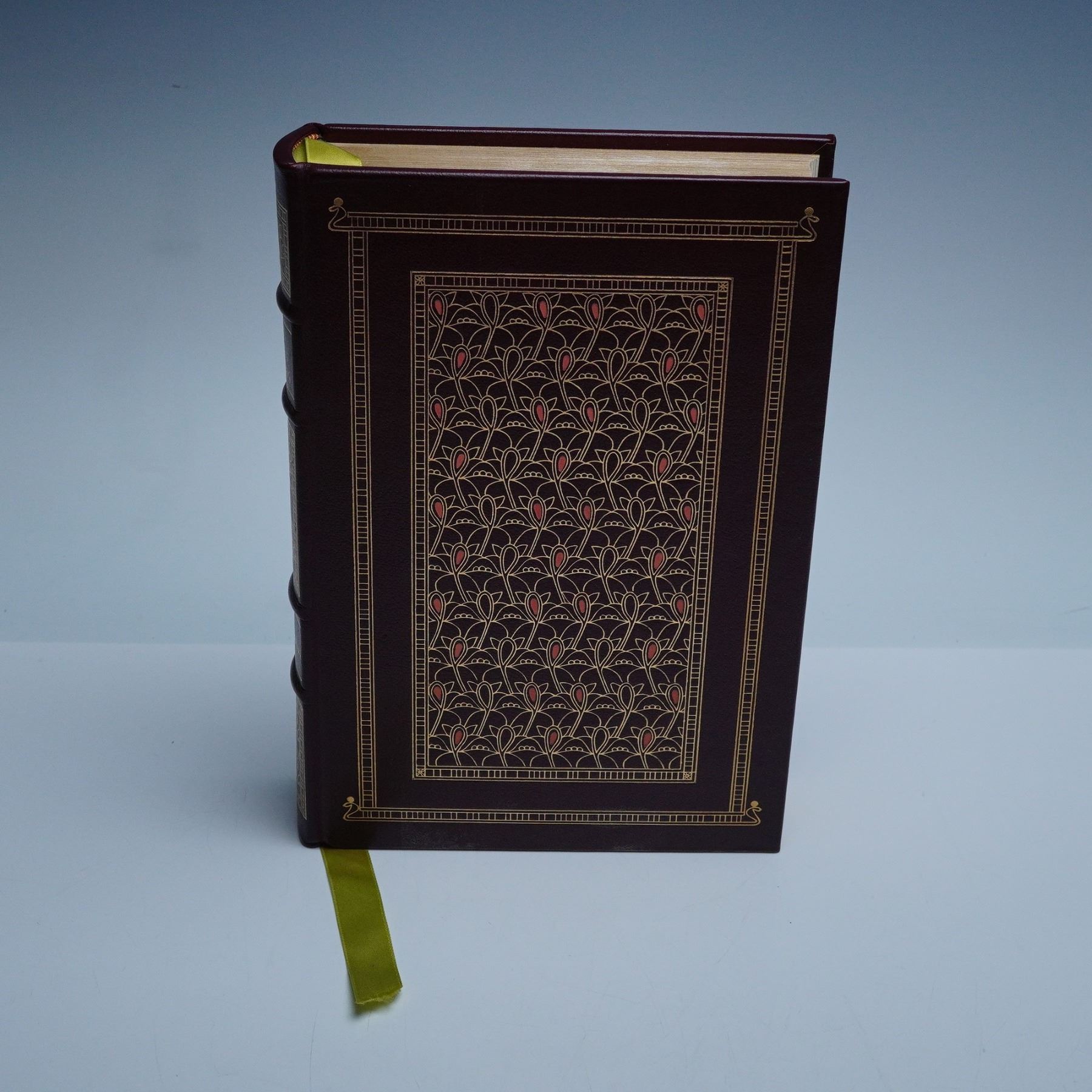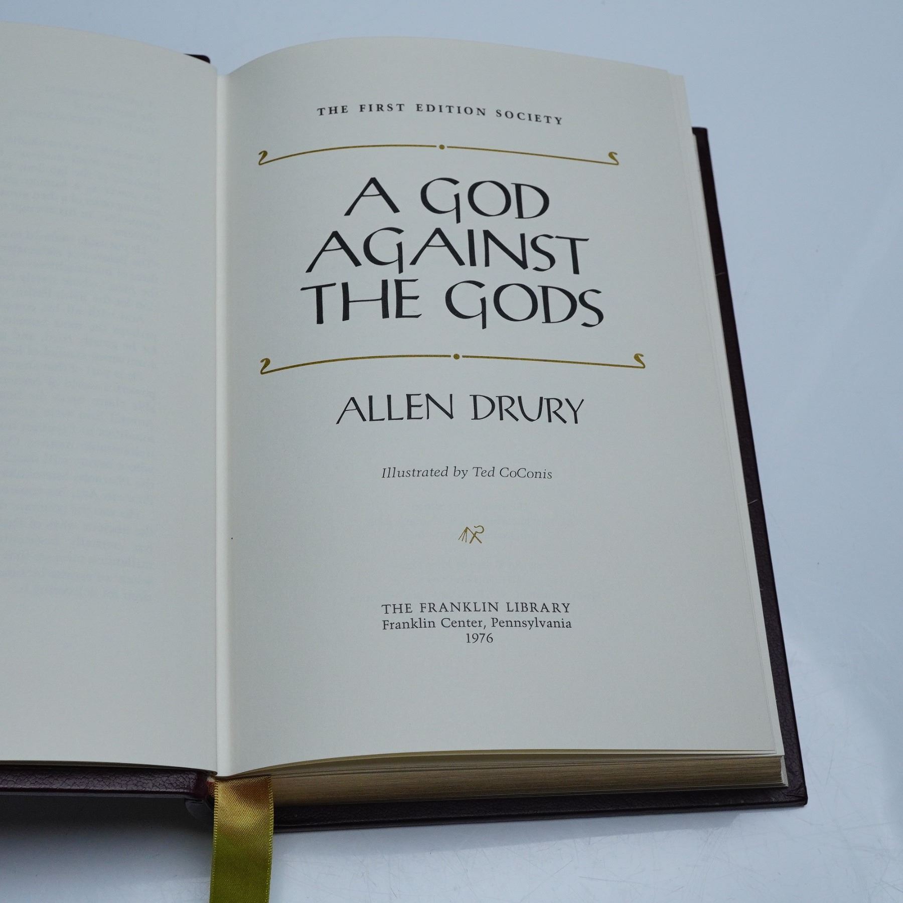 Franklin Library First Edition Society printing of A God Against the Gods by Allen Drury, illustrated by Ted CoConis and published in 1976. This collector's volume features a richly gilt-stamped maroon leather binding with decorative endpapers, gilded page edges, and an attached satin ribbon bookmark. Issued exclusively to subscribers of the First Edition Society, this edition was printed on archival-quality paper at Franklin Center, Pennsylvania. 403 pages. Measures 7.5"L x 9.5"H.