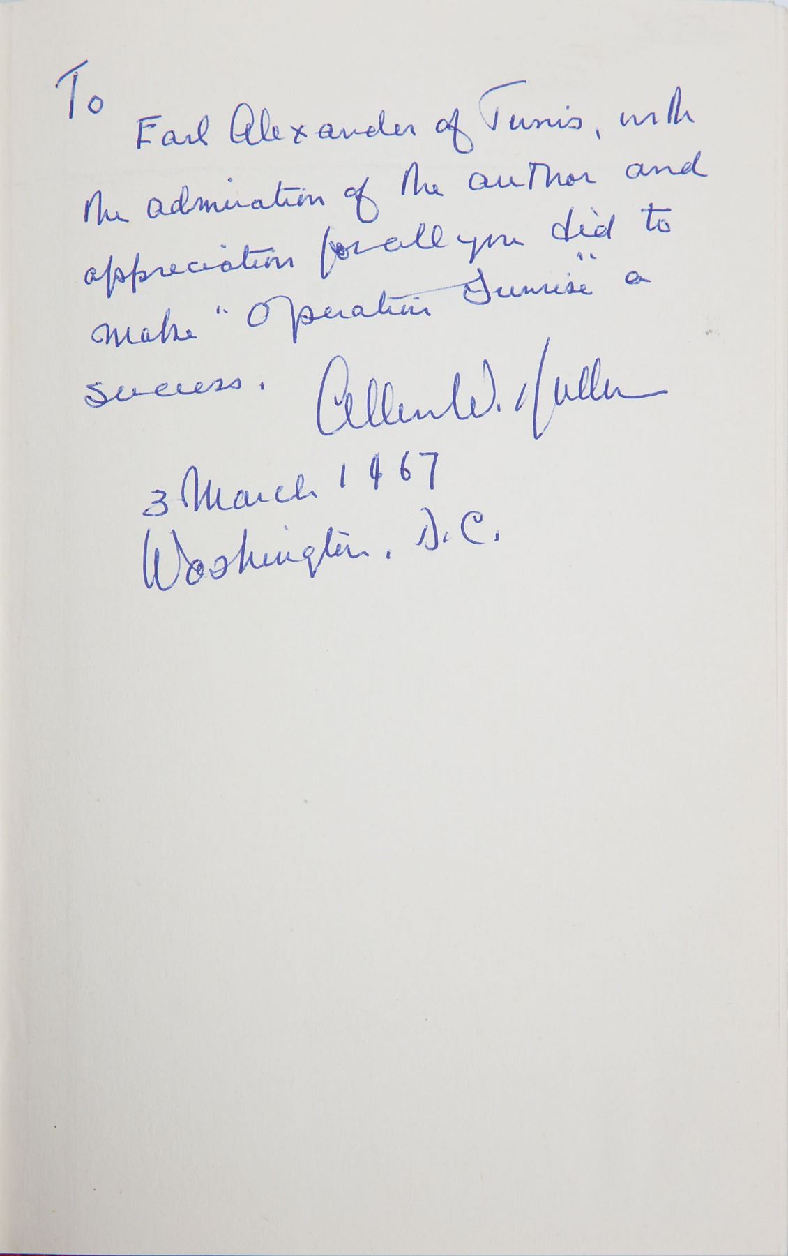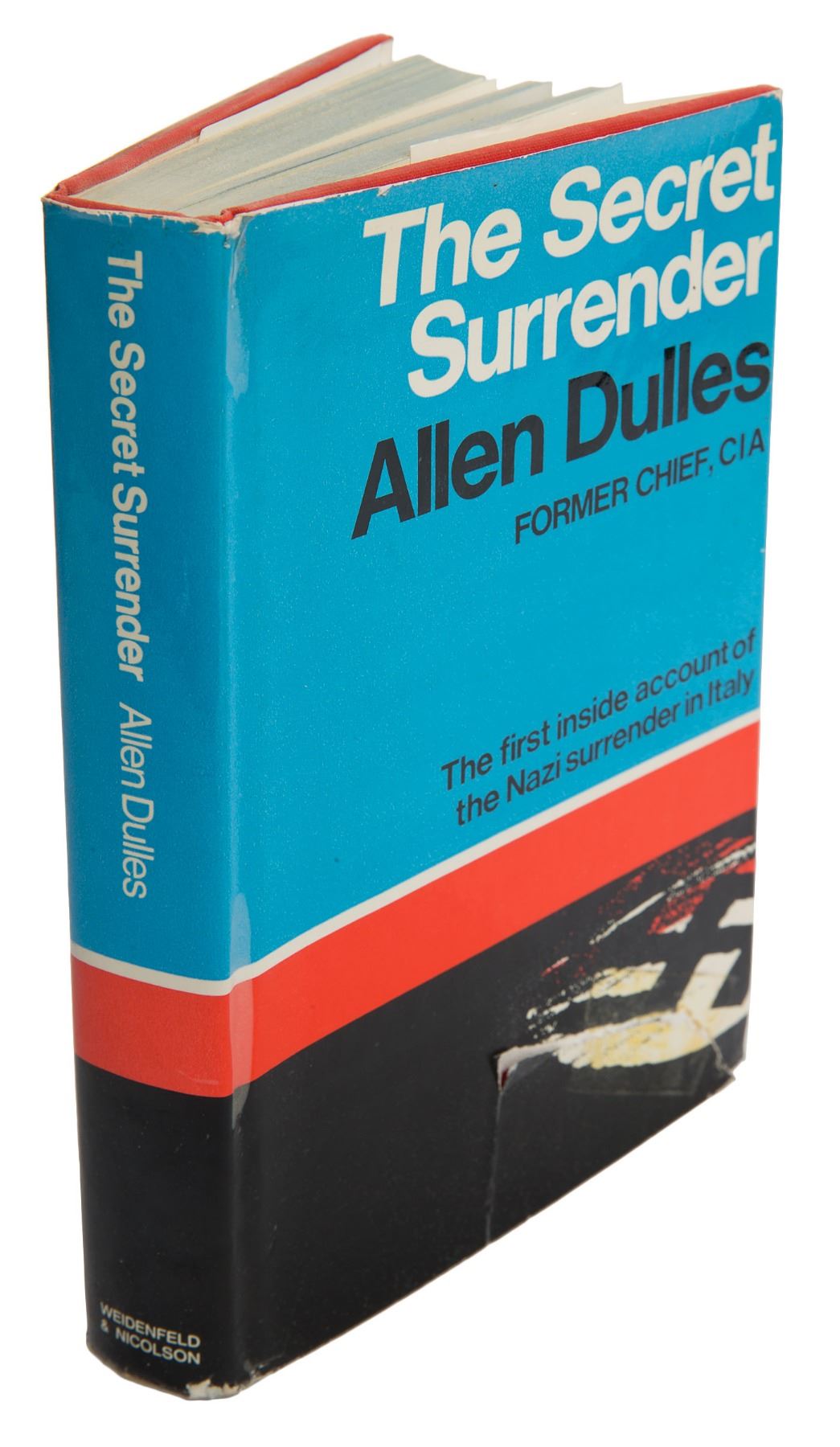 American diplomat and lawyer who became the first civilian director of the CIA (1893–1969). Signed book: The Secret Surrender. First British edition. London: Weidenfeld and Nicolson, 1967. Hardcover with dust jacket, 5.75 x 8.75, 268 pages. Signed and inscribed on the first free end page in blue ballpoint, "To Earl Alexander of Tunis, with the admiration of the author and appreciation for all you did to make 'Operation Sunrise' a success. Allen W. Dulles, 3 March 1967, Washington, D.C." In fine condition, with a crudely tape-repaired tear to the front of the dust jacket. 'Operation Sunrise' refers to a series of secret negotiations led by Dulles between Nazi Germany and the Western Allies to arrange a surrender of German forces in northern Italy; it was Field Marshal Harold Alexander that ultimately secured the surrender, and he is mentioned numerous times throughout the book. A superb association piece.