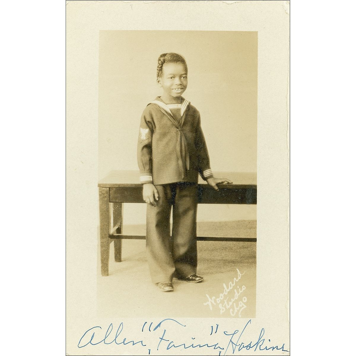 American actor (1920-1980) best remembered as the character ''Farina'' in the Our Gang film shorts of the 1920s and early '30s. At the end of his decade-long stint with the series in 1931, Hoskins was the most popular and highest paid of the juvenile stars in the series. Scarce vintage matte-finish 3.5 x 5.5 photo of the young Hoskins in a sailor suit at the height of his juvenile popularity, signed in ink ''Allen 'Farina' Hoskins.'' Light silvering to dark portions and a hint of subtle edge wear, otherwise fine condition