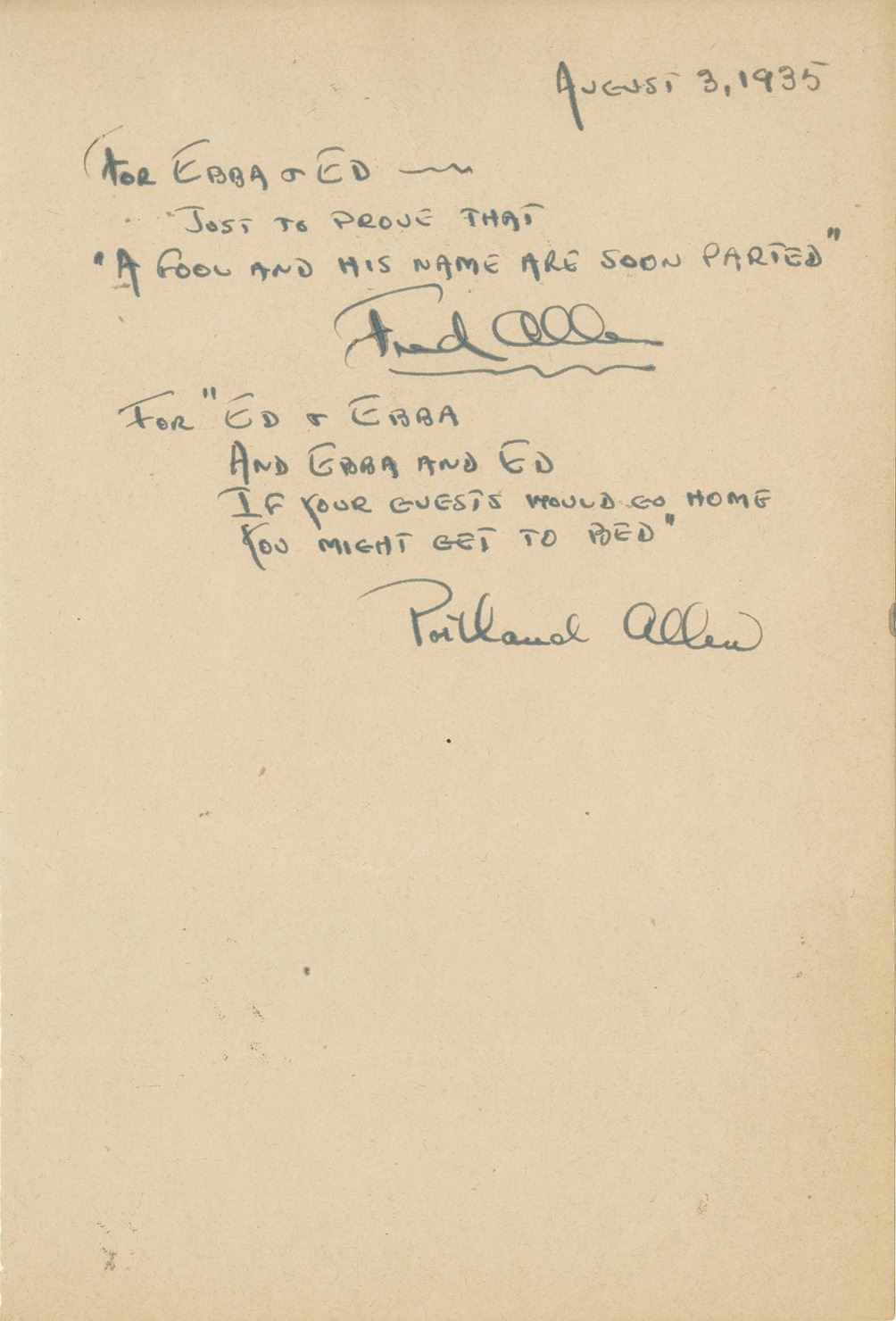 106. * Allen, Fred. Autograph note signed ("Fred Allen"), 1-page (5.5 x 8.25 in.; 140 x 210 mm), no place, 3 August 1935, written to "Ebba & Ed". Light toning along edges.